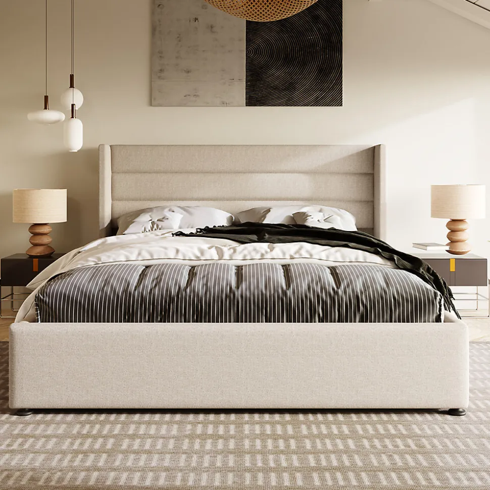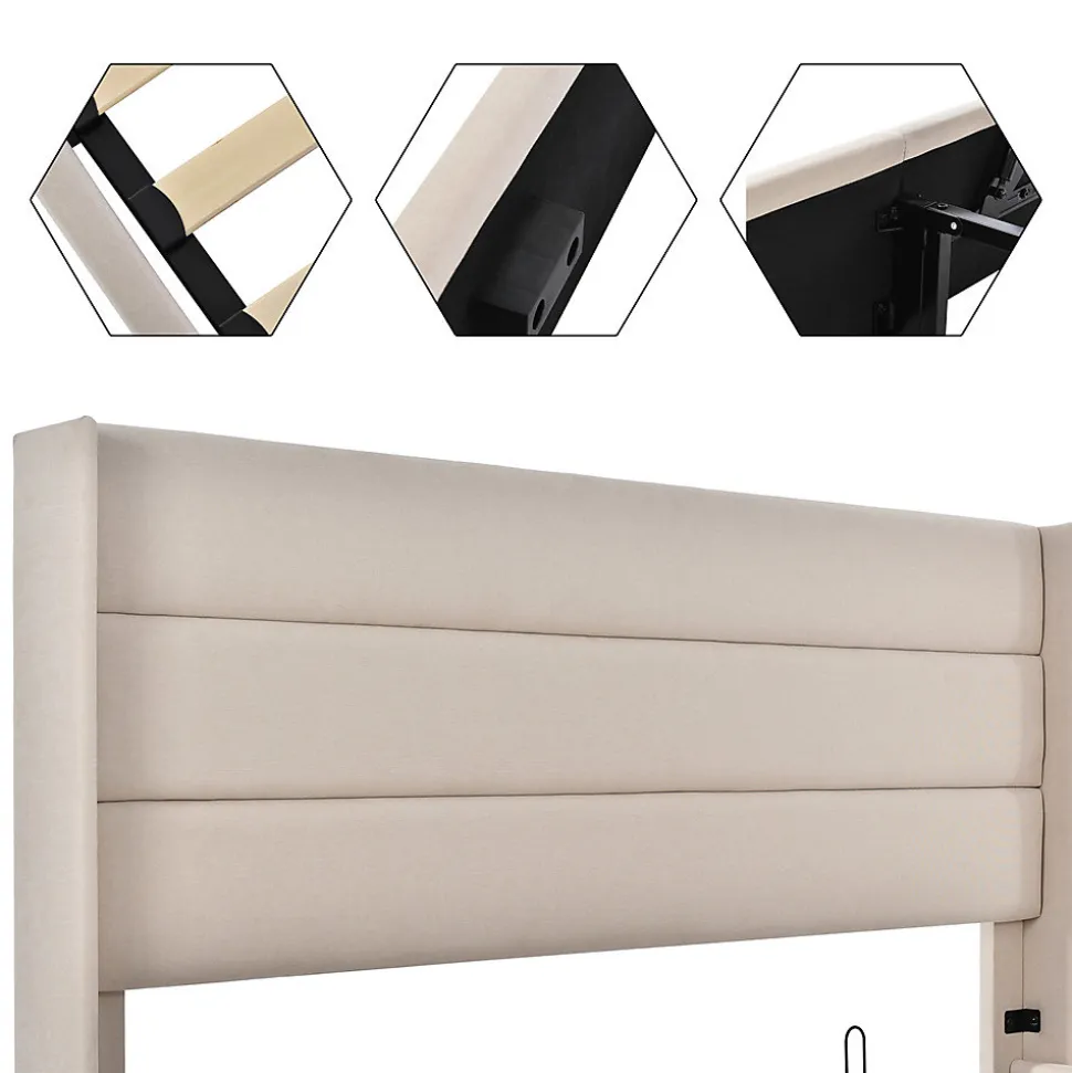 Dimensions totales :214.5×153.5x114cm(LxLxH)Capacité de charge :181KG/400 LBSCouleur :BeigeMatériau du plateau :linHauteur du pied de lit :28cmNombre de paquets : 2Montage nécessaire : OuiType de matelas :Sans matelasDesign moderne : La tête de lit présente un design unique qui assemble trois panneaux de tissu rembourrés. Le design simple des coutures deviendra la pièce maîtresse de votre chambre à coucher. Ce lit est disponible en deux couleurs : gris et beige.Un design humain : Ce produit est également doté d’une sangle de traction en tissu qui permet de relever et d’abaisser facilement le sommier hydraulique. La tête de lit rembourrée vous permet de lire un livre confortablement dans votre lit et offre un soutien confortable à votre dos.Barre hydraulique – Espace de rangement : Grand sommier sous le sommier à lattes rabattable avec beaucoup d’espace de stockage pour ranger les couvertures, les oreillers ou le linge de lit, le sommier à lattes peut être facilement replié par le vérin de levage.Construction solide :Fabriqué à partir de matériaux de la plus haute qualité pour garantir que le lit durera de nombreuses années, des raccords robustes et des pieds de support supplémentaires assurent la stabilité globale du lit.Informations détaillées :Le lit est disponible en TROIS tailles, 140x200cm,160x200cm et 180×200 cm.Pour réduire le risque de dommages, ce cadre de lit est expédié dans 2 boîtes et ils peuvent arriver à des jours différents.Remarques :En raison des mesures manuelles, une erreur de 2 à 3 cm peut se produire. Toutes les photos des produits sont prises avec des produits réels, mais en raison de l’influence de la lumière du soleil et d’autres facteurs, il peut y avoir certaines différences de couleur.