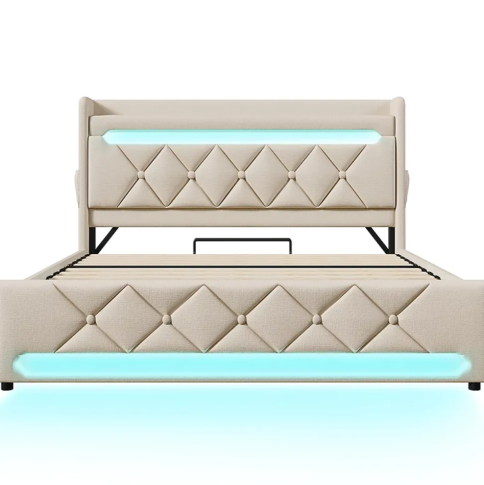 Couleur : BeigeDimensions totales : 225x146x111cm(LxLxH)Matériau des panneaux : LinPoids brut/poids net (KG) : 57.2/52.2 KGMax. Poids de l’utilisateur : 250kg/551lbsMatelas applicable (matelas non inclus) : 140×200 CMEpaisseur recommandée du matelas : 25cmType de charge : USBx3+Type Cx1Assemblage requis : OuiContenu de l’emballage : Cadre de lit+fonction de charge+LEDQuantité du paquet : 2Éclairage LED innovant:Vous pouvez contrôler la barre via un bouton/APP/télécommande pour créer un spectacle lumineux impressionnant avec de la musique et des dizaines de milliers de couleurs de lumière pour vous donner une atmosphère de sommeil étonnante.Tête de lit de rangement avec chargeur en vedette:Il y a trois prises USB à la tête du lit ainsi qu’un port de charge de type C. L’une des prises USB est une prise de charge rapide.Espace de rangement sur plusieurs niveaux:Surfaces de rangement sur le lit pour les objets du quotidien, les téléphones portables ou les tablettes, avec un espace de rangement ouvert à la tête du lit ; deux poches de rangement latérales sur le côté du lit pour les objets à portée de main ; espace de rangement hydraulique sous le lit, l’espace de rangement peut être facilement ouvert à l’aide de sangles de traction.Construction solide:Le cadre principal est en fer pour assurer la stabilité du lit et la capacité de charge de 551 lbs. Les points de contact du cadre sont équipés de patchs silencieux EVA pour réduire le bruit, et le lit a une barre d’arrêt à l’extrémité de la tête afin que le matelas ne soit pas facile à glisser, offrant aux clients une expérience de sommeil confortable.