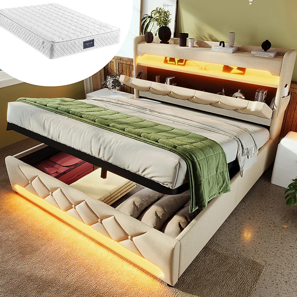 Couleur : BeigeDimensions totales : 225x166x111cm(LxLxH)Matériau des panneaux : LinPoids brut/poids net (KG) : 60.0/55.0 KGMax. Poids de l’utilisateur : 250kg/551lbsType de charge : USBx3+Type Cx1Assemblage requis : OuiContenu de l’emballage : Cadre de lit+fonction de charge+LEDQuantité du paquet : 2Le matelas comporte 720 ressorts et se compose de deux couches de mousse qui sont non seulement douces, mais aussi souples et confortables. Nous utilisons des textiles non toxiques qui ont été testés conformément à la norme Oeko-Tex 100 et qui sont sûrs et non allergènes !Éclairage LED innovant:Vous pouvez contrôler la barre via un bouton/APP/télécommande pour créer un spectacle lumineux impressionnant avec de la musique et des dizaines de milliers de couleurs de lumière pour vous donner une atmosphère de sommeil étonnante.Tête de lit de rangement avec chargeur en vedette:Il y a trois prises USB à la tête du lit ainsi qu’un port de charge de type C. L’une des prises USB est une prise de charge rapide.Espace de rangement sur plusieurs niveaux:Surfaces de rangement sur le lit pour les objets du quotidien, les téléphones portables ou les tablettes, avec un espace de rangement ouvert à la tête du lit ; deux poches de rangement latérales sur le côté du lit pour les objets à portée de main ; espace de rangement hydraulique sous le lit, l’espace de rangement peut être facilement ouvert à l’aide de sangles de traction.Construction solide:Le cadre principal est en fer pour assurer la stabilité du lit et la capacité de charge de 551lbs. Les points de contact du cadre sont équipés de patchs silencieux EVA pour réduire le bruit, et le lit a une barre d’arrêt à l’extrémité de la tête afin que le matelas ne soit pas facile à glisser, offrant aux clients une expérience de sommeil confortable.