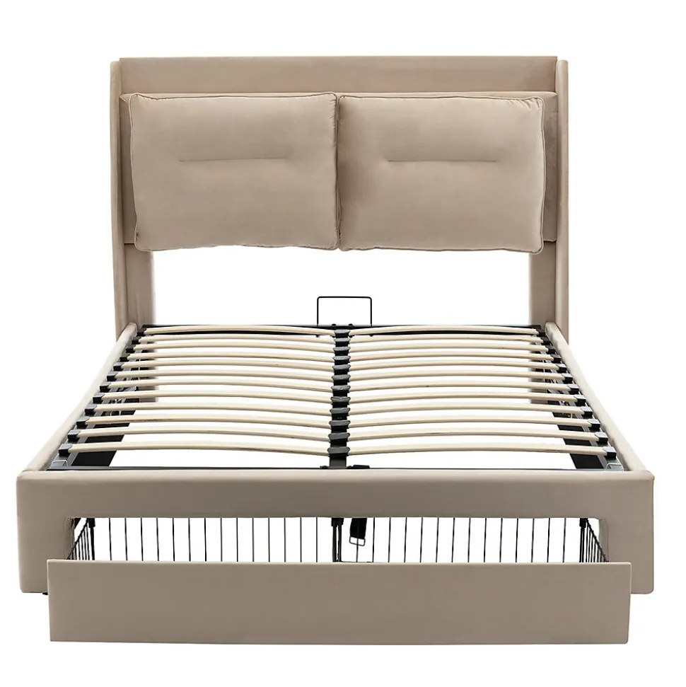 Dimensions du produit : 208x166x114cm(LxPxH)Dimensions intérieures du lit : 160x200cmRemarque sur les dimensions : Toutes les dimensions sont approximativesCouleur principale : BeigeMatériau principal : veloursPoids net : 55.1 kgCapacité de charge maximale : 300 kgAssemblage requis : OuiType de matelas : sans matelasNombre de paquets : 2RANGEMENT MULTIFONCTIONNEL:Ce lit dispose d’une variété de fonctions de rangement, notamment un lit de rangement hydraulique, un tiroir de rangement 2 en 1 à l’extrémité du lit et une tête de lit. Ces espaces de rangement vous offrent des options de rangement pratiques qui vous permettent d’utiliser l’espace de manière efficace et de garder votre chambre à coucher rangée et organisée.DOSSIER CONFORTABLE:Le lit est équipé de deux dossiers rembourrés qui rendent le lit plus confortable et vous apportent soutien et confort lorsque vous lisez, vous reposez ou regardez la télévision au lit.BARRE LUMINEUSE RÉGLABLE:La barre lumineuse LED intégrée des deux côtés du lit fournit non seulement un éclairage doux, mais peut également être réglée en différentes couleurs pour créer différentes ambiances et rendre votre chambre à coucher plus chaleureuse et plus romantique.Conception robuste:Le lit est équipé de 2 pieds réglables à la tête et au pied du lit, soit un total de 4. Cette conception garantit la stabilité du lit et peut s’adapter à différentes conditions de sol, assurant ainsi la stabilité et la sécurité du lit.MATÉRIAUX DE QUALITÉ:Le corps du lit est en velours, qui est non seulement doux et confortable, mais aussi durable et résistant à l’usure. En outre, le sommier à lattes offre un bon soutien, ce qui contribue à prolonger la durée de vie du matelas et à garantir un sommeil de qualité.
