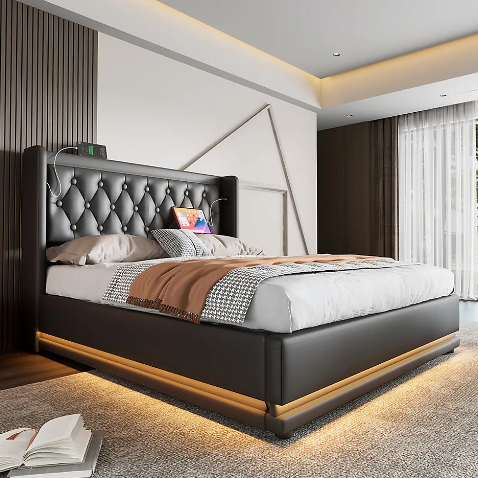 Dimensions totales :210x190x100.5cm(LxLxH)Capacité de charge :300KG/660LBSCouleur :noirMatériau :PU+métalNombre de paquets : 2Poids net :50.23kgMontage nécessaire : OuiMatelas inclus : NonStyle classique et design pratique :La tête de lit présente un design classique et touffeté avec des boutons pour soutenir délicatement votre cou et créer un environnement de sommeil douillet.Grâce aux ports de charge USB et Type-C situés de part et d’autre du vous pouvez utiliser vos appareils électroniques au lit quand vous le souhaitez sans craindre d’être à court de batterie.Espace de rangement sous le lit :Le lit relevable avec rangement est doté d’une conception unique d’élévateur hydraulique à air de haute qualité qui offre un vaste espace de rangement sous le lit et peut être facilement relevé, abaissé ou fermé.Le dessous du lit est recouvert d’un tissu non tissé qui empêche la poussière de pénétrer et garde les choses en ordre.Système de soutien solide :Le cadre du lit est fabriqué en acier de haute qualité et les pieds renforcés empêchent la structure de se tordre. La surface est peinte, elle ne se déforme pas et ne rouille pas. Cadre en acier de haute qualité avec des lattes élastiques de haute qualité pour soutenir le dos et fournir une bonne expérience de sommeil, le lit est livré avec une barre d’arrêt pour empêcher le matelas de glisser.Éclairage LED innovant :La bande lumineuse LED à 3 côtés du lit, au design innovant, permet de changer 16 couleurs. Vous pouvez régler différents modes de clignotement et de luminosité pour créer un spectacle lumineux impressionnant entouré de trois côtés pour vous donner une atmosphère de sommeil impressionnante.Ce lit est disponible en deux couleurs :PU blanc, PU noir ; le tissu PU est facile à nettoyer. Chaque couleur a quatre tailles : 90x200cm/140x200cm/160x200cm/180x200cm.