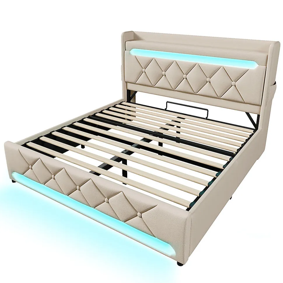 Couleur : BeigeDimensions totales : 225x186x111cm(LxLxH)Matériau des panneaux : LinPoids brut/poids net (KG) : 67.4/62.4 KGMax. Poids de l’utilisateur : 300kg/661lbsMatelas applicable (matelas non inclus) : 180×200 CMEpaisseur recommandée du matelas : 25cmType de charge : USBx3+Type Cx1Assemblage requis : OuiContenu de l’emballage : Cadre de lit+fonction de charge+LEDQuantité du paquet : 3Éclairage LED innovant:Vous pouvez contrôler la barre via un bouton/APP/télécommande pour créer un spectacle lumineux impressionnant avec de la musique et des dizaines de milliers de couleurs de lumière pour vous donner une atmosphère de sommeil étonnante.Tête de lit de rangement avec chargeur en vedette:Il y a trois prises USB à la tête du lit ainsi qu’un port de charge de type C. L’une des prises USB est une prise de charge rapide.Espace de rangement sur plusieurs niveaux:Surfaces de rangement sur le lit pour les objets du quotidien, les téléphones portables ou les tablettes, avec un espace de rangement ouvert à la tête du lit ; deux poches de rangement latérales sur le côté du lit pour les objets à portée de main ; espace de rangement hydraulique sous le lit, l’espace de rangement peut être facilement ouvert à l’aide de sangles de traction.Construction solide:Le cadre principal est en fer pour assurer la stabilité du lit et la capacité de charge de 661 lbs. Les points de contact du cadre sont équipés de patchs silencieux EVA pour réduire le bruit, et le lit a une barre d’arrêt à l’extrémité de la tête afin que le matelas ne soit pas facile à glisser, offrant aux clients une expérience de sommeil confortable.