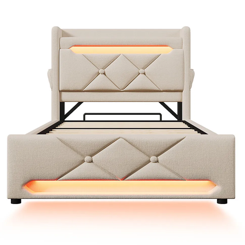 Couleur : BeigeDimensions totales : 225x96x111cm(LxLxH)Matériau du panneau : LinMax. Poids de l’utilisateur : 150KG/330LBSPoids brut/poids net (KG) : 47,6/42,6 KGMatelas applicable (matelas non inclus) : 90×200 CMEpaisseur recommandée du matelas : 25cmType de charge : USBx3+Type Cx1Assemblage requis : OuiContenu de l’emballage : Cadre de lit+fonction de charge+LEDQuantité du paquet : 2Éclairage LED innovant:Vous pouvez contrôler la barre via un bouton/APP/télécommande pour créer un spectacle lumineux impressionnant avec de la musique et des dizaines de milliers de couleurs de lumière pour vous donner une atmosphère de sommeil étonnante.Tête de lit de rangement avec chargeur en vedette:Il y a trois prises USB à la tête du lit ainsi qu’un port de charge de type C. L’une des prises USB est une prise de charge rapide.Espace de rangement sur plusieurs niveaux:Surfaces de rangement sur le lit pour les objets du quotidien, les téléphones portables ou les tablettes, avec un espace de rangement ouvert à la tête du lit ; deux poches de rangement latérales sur le côté du lit pour les objets à portée de main ; espace de rangement hydraulique sous le lit, l’espace de rangement peut être facilement ouvert à l’aide de sangles de traction.Construction solide:Le cadre principal est en fer pour assurer la stabilité du lit et la capacité de charge de 330lbs. Les points de contact du cadre sont équipés de patchs silencieux EVA pour réduire le bruit, et le lit a une barre d’arrêt à l’extrémité de la tête afin que le matelas ne soit pas facile à glisser, offrant aux clients une expérience de sommeil confortable.