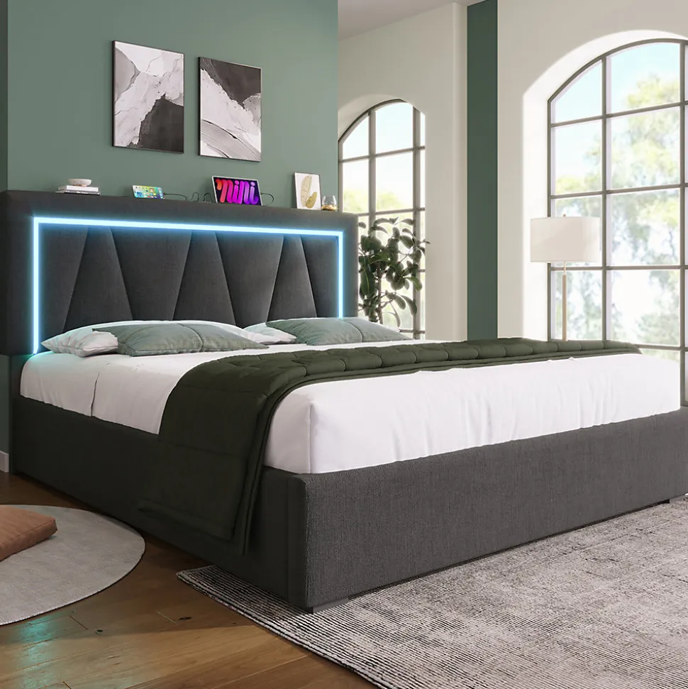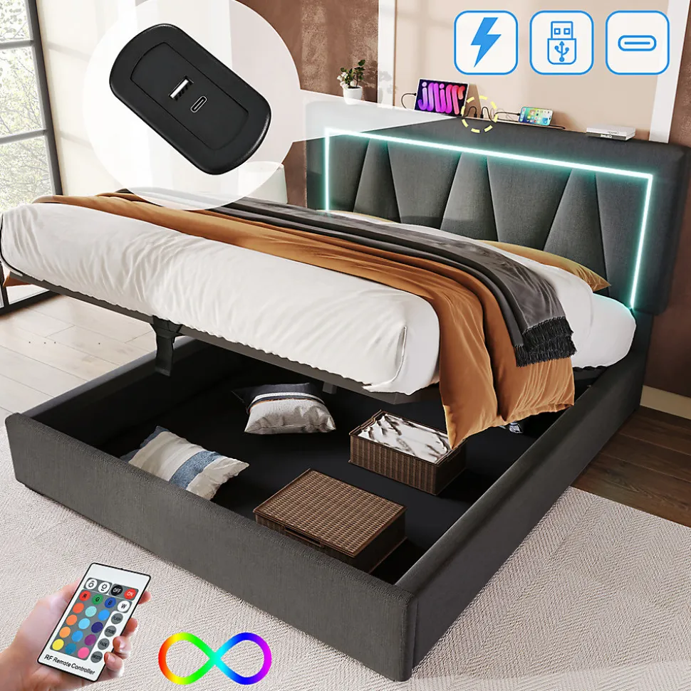 Dimensions totales :208×146.5×90.5-110.5cm(LxLxH)Capacité de charge :360kg/793lbsCouleur :grisMatériau :linPoids brut/poids net :50/47.2kgNombre de paquets : 2Montage nécessaire : OuiType de matelas :Sans matelasTête de lit réglable en hauteur :La tête de lit rembourrée de forme géométrique donne à la chambre à coucher une touche de modernité. La hauteur de la tête de lit est réglable, et la plage de réglage est d’environ 20 cm.L’épaisseur du matelas applicable est d’environ 12 à 32 cm.Station de recharge avec connexion USB : L’une des caractéristiques les plus utiles est la prise USB intégrée à la tête du lit, qui dispose à la fois d’un port USB intégré et d’un port de type C, ce qui vous permet de recharger votre téléphone portable et votre tablette avant d’aller vous coucher.Éclairage LED : L’éclairage LED à la tête du lit ajoute une touche de modernité à votre chambre. Grâce à la télécommande, vous pouvez modifier les différentes couleurs, vitesses et luminosités pour créer une atmosphère unique pour votre temps de repos, en fonction de votre humeur.La praticité rencontre le design : Le lit harmonise habilement un design élégant et un confort maximal. Les boutons décoratifs affinent la tête de lit et lui donnent une touche de modernité.Le cadre du lit est principalement en fer, il est durable et a une capacité de charge allant jusqu’à 793 LBS.Les pieds de soutien supplémentaires du pôle central peuvent assurer la stabilité fiable du lit.Espace de rangement flexible et spacieux : Les téléphones portables peuvent être rangés à la tête du lit. Soutenu par des vérins à gaz, l’espace sous le sommier à lattes peut être utilisé pour ranger des objets de grande taille. Le sommier à lattes peut être facilement relevé en soulevant les bandes de tissu.Informations détaillées :Si vous déplacez le lit, veuillez le soulever au lieu de le traîner sur le sol.