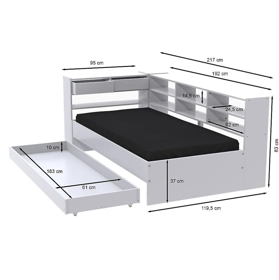 Lit étagère ROLLER 90×190 cmOptimisez la chambre de votre enfant grâce au lit ROLLER. Son design compact offre plusieurs solutions de rangement : un véritable atout pour les petits espaces.Caractéristiques : Structure panneau de particules.Fonds de tiroirs en panneau de fibres.Etagères : Petite 95 x 83 x 24,5 cm – Grande 192 x 83 x 24,5 cm.Dimensions hors tout: 217 x 83 x 119,5 cm.Dimensions intérieurs tiroir: 183 x 10 x 61 cm.Chaque élément est indépendant et peut être utilisé séparément. Finition : blanc.Livré démonté, avec un sommier à lattes et sans matelas. A monter soi-même.Dimensions:217×119,5×83