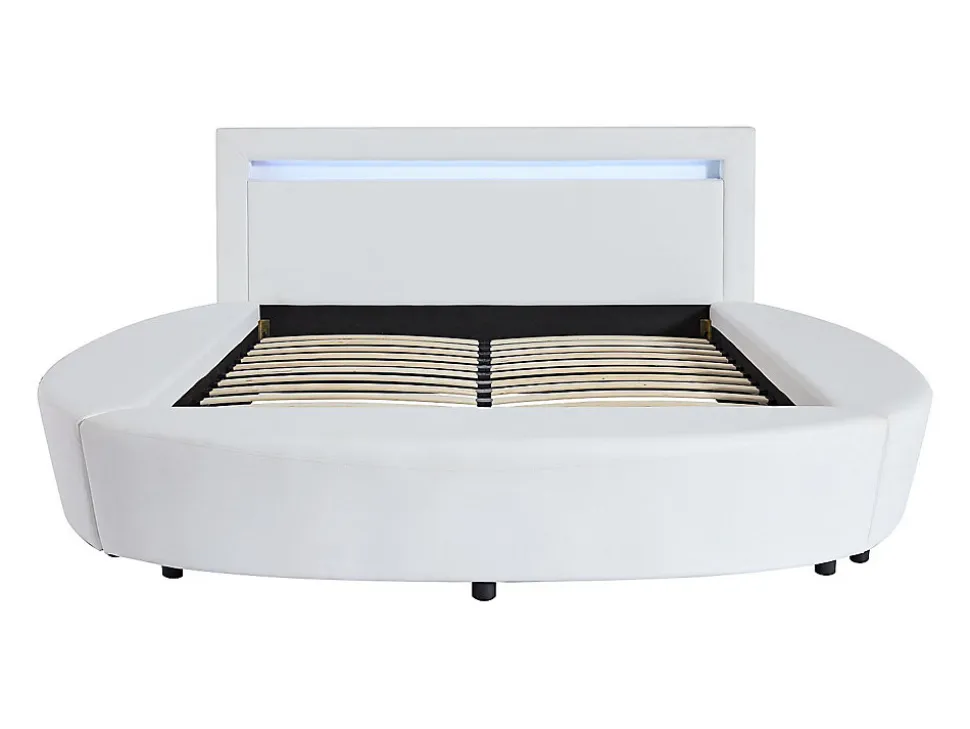 - Lit rond 160 x 200 cm – Avec LEDs – Structure : Contreplaqué – Revêtement : Simili – Coloris : Blanc – Dimensions : L193 x P259 x H99 cm – Style : Design – Apportez de l’éclat à votre chambre avec le lit ABULIS III !