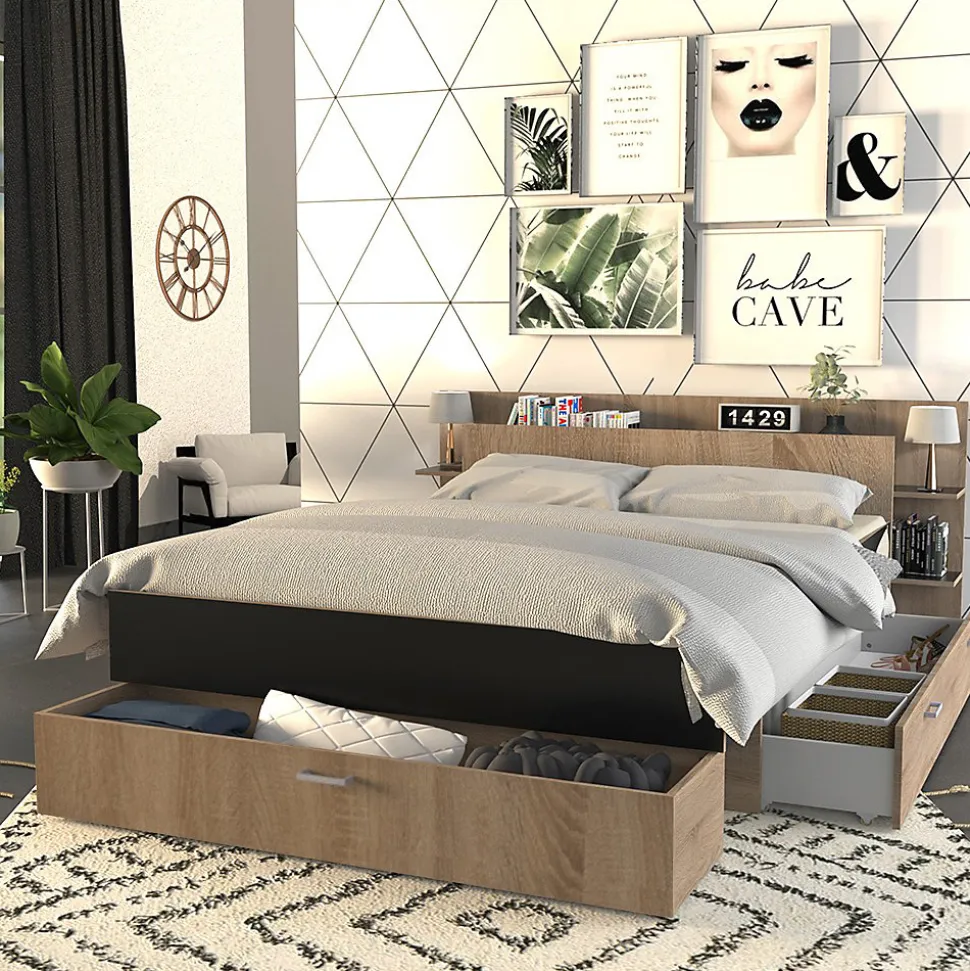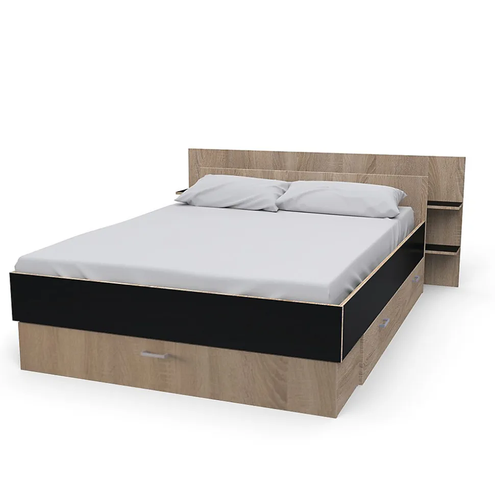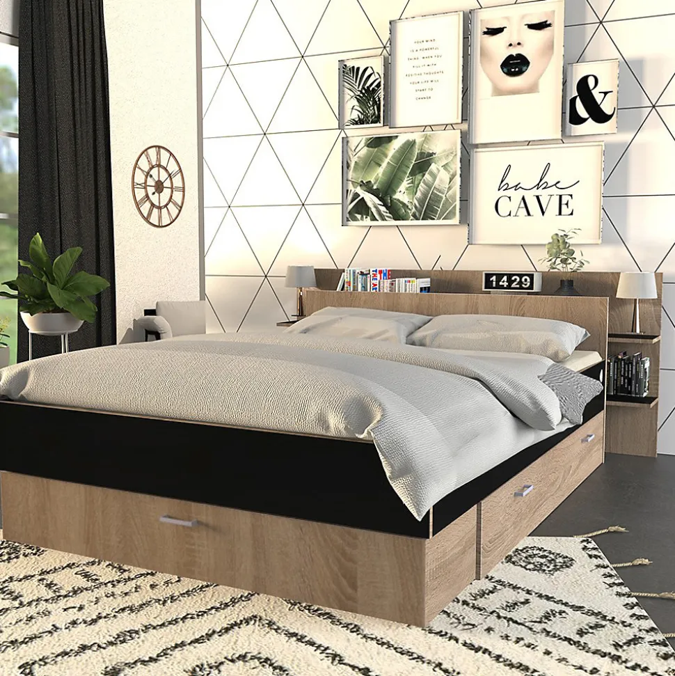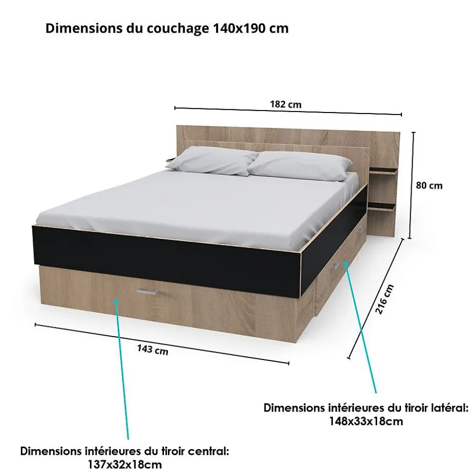 Lit SAMBA 140x190cm + tête de lit étagère + 2 tiroirs de rangementLe lit SAMBA vous offre un maximum d’espaces de rangement grâce à sa tête de lit étagère ainsi que ses deux tiroirs montés sur roulettes. Quel bonheur d’avoir plus de rangements sans sacrifier des mètres carrés !Caractéristiques : Cadre: Structure en panneau de particulesFinition: Noir et chêne blanchiDimensions intérieures du tiroir latéral : L148xP33xH18 cmDimensions intérieures du tiroir central : L137xP32xH18 cmLivré démonté, sans sommier, sans matelas. Prévoir un sommier à cadre. A monter soi-mêmeDimensions:216x180x80