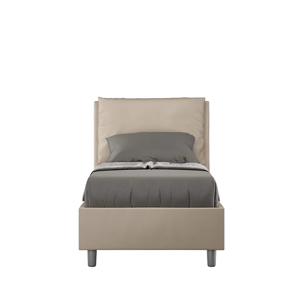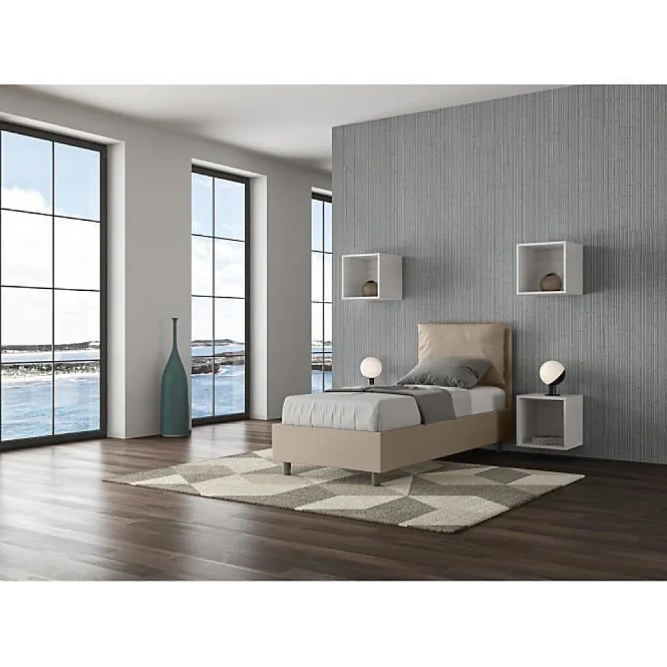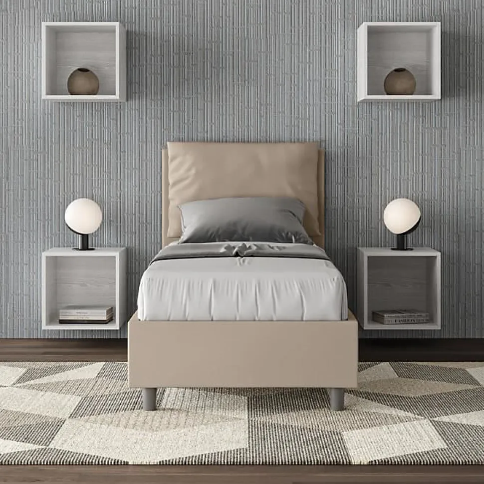 Lit simple Antea 80×190 avec tête de lit et lit rembourrés, revêtement en simili cuir, particulièrement polyvalent et facilement combinable avec n’importe quel style d’ameublement.Le lit simple Antea 80×190 se caractérise par un style élégant et raffiné grâce aux grands coussins de la tête de lit, il est entièrement recouvert de simili cuir.La présence du matériau en simili cuir, en plus de donner à la pièce une atmosphère accueillante et invitante, offre la commodité d’un nettoyage rapide et facile, grâce à l’utilisation d’un simple chiffon en microfibre.Lit fourni avec sommier à lattes, prévu pour un matelas 80×190 cm – Matelas non inclusHousse de coussin amovible.Produit ItyhomeFabriqué en ItalieDimensions lit : L.95 P.202 H.110 cmHauteur des pieds : 12 cmHauteur du lit : 27 cmHauteur du filet depuis le sol : 39 cm