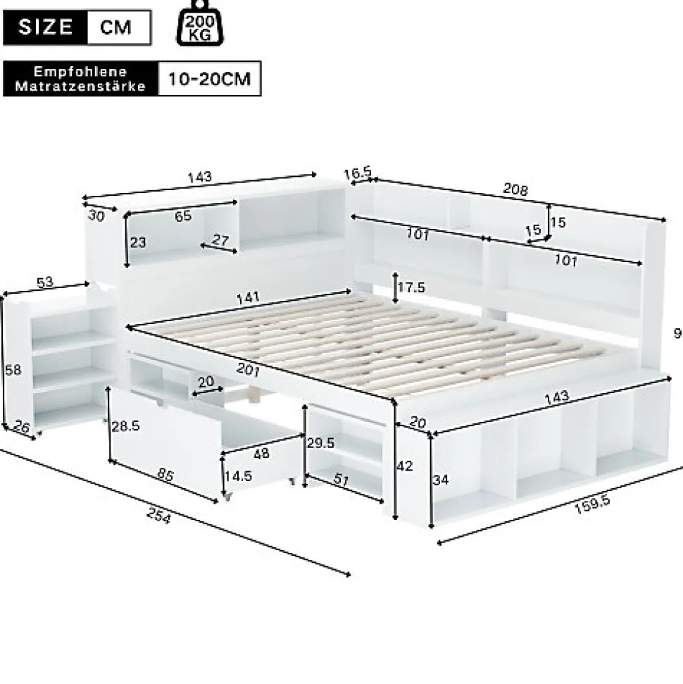 Spécifications●Matière : Contreplaqué●Dimensions du produit : 254*159*91 CM●Poids du produit: 100 KG●Capacité de transport : 200 KG●Taille du matelas applicable : 140×200 cm (matelas non compris)●Épaisseur du matelas applicable : 10-20 cm●Assemblage nécessaire, outils et instructions inclus.Attention●4 colis peuvent être livrés séparément.●La livraison comprend le cadre de lit et les lattes (hors matelas).●Si vous avez d’autres questions, n’hésitez pas à nous contacter.●Veuillez noter que la couleur du produit dépend du produit réel ; en raison des données de mesure manuelle, il peut y avoir une erreur de 2 à 3 cm.
