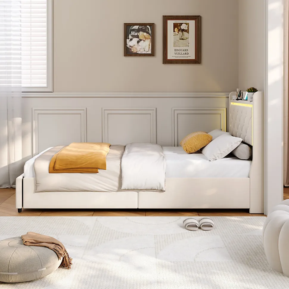Tissu velours doux et élégant : Revêtement en velours beige de haute qualité, agréable au toucher et confortable pour un sommeil de qualité. Rangement tête de lit et lit à gaz : Compartiments pratiques dans la tête de lit et lit à gaz pour ranger linge de lit, vêtements ou accessoires. Éclairage LED intégré : Lampes décoratives sur la tête de lit pour une ambiance chaleureuse et moderne dans la chambre. Port USB et Type-C pratique : Chargez facilement vos appareils électroniques sans encombrer la chambre avec des câbles supplémentaires. Construction robuste et durable : Structure solide et matériaux de qualité garantissant stabilité, confort et utilisation en toute sécurité au quotidien. Remarque : Taille applicable : 90 x 200 cm (hors matelas) Pour garantir la sécurité, les produits sont expédiés par lots et peuvent ne pas arriver le même jour. Veuillez patienter.