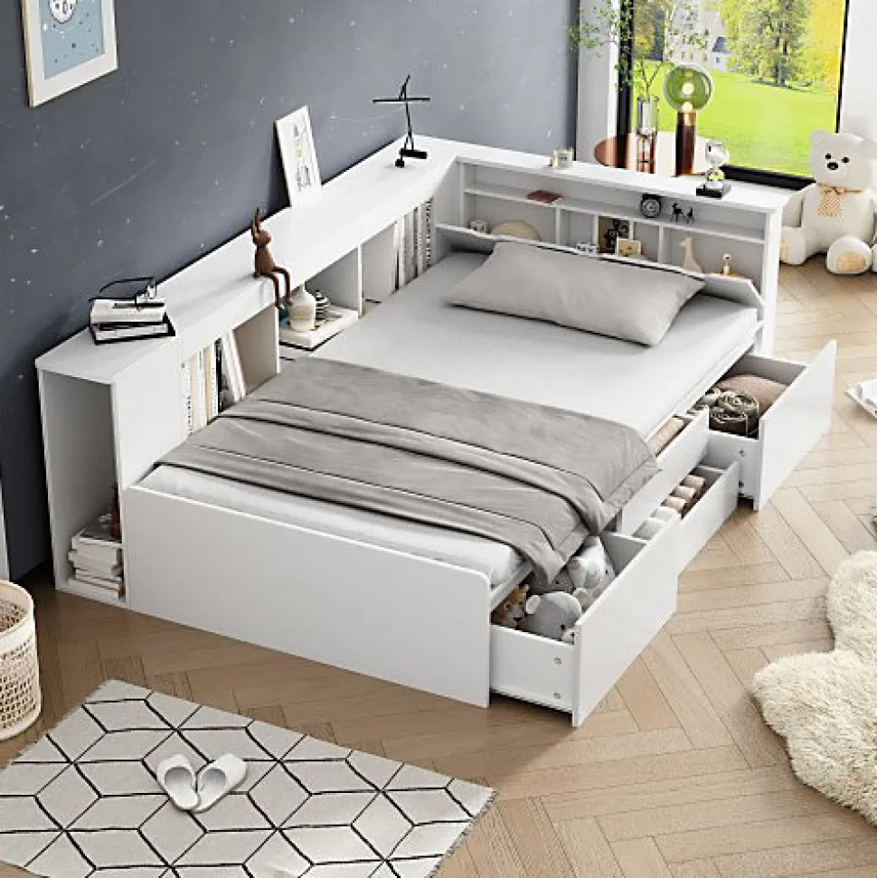 •【Conception simple et élégante】Le design du cadre de lit blanc est simple et élégant, adapté aux chambres d’enfants avec différents styles de mobilier, offrant un aspect frais et lumineux et stimulant l’imagination et la créativité des enfants•【Rangement multifonctionnel】Le lit dispose de 4 tiroirs sur le côté, d’étagères et d’armoires de rangement sur le lit, permettant de ranger livres, jouets et autres objets, rendant la chambre plus ordonnée•【Bois massif de haute qualité】Le cadre de lit est en bois massif, robuste et durable, assurant une longue durée de vie et une bonne capacité de charge, sûr pour la santé de votre enfant•【Facile à installer】Le lit est facile à assembler avec les instructions détaillées fournies, même sans expérience préalable, permettant un montage rapide et sans effort.