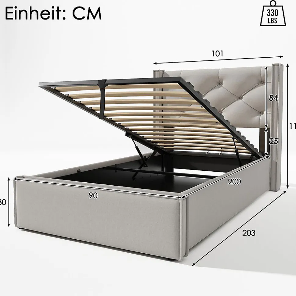 Lit simple hydraulique 90×200 cm – Gris clair (coton & métal)Fonctionnalités clés :Rangement pratique : Coffre spacieux sous le lit (83×193 cm) avec système hydrauliqueConfort optimal : Tête de lit rembourrée et sommier à lattes en pinDesign sobre : Style moderne avec finition en coton douxStructure robuste : Cadre métal + bois (150 kg max)Détails techniques :Dimensions : 203x101x110 cmLivraison : 2 colis (22,9 kg + 16,5 kg)Montage : Requis (notice incluse)Idéal pour : Chambres d’ado ou studio, gain de place.