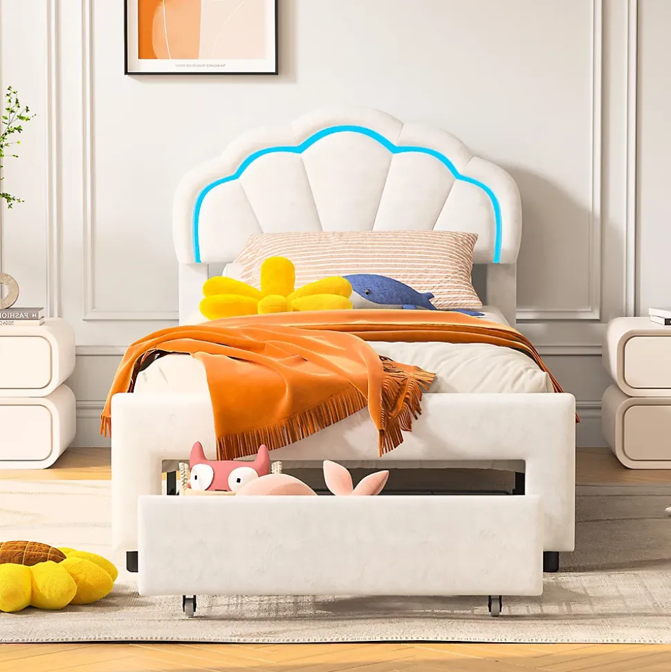 Description Matériau en velours doux : tissu en velours sélectionné de haute qualité, doux et délicat au toucher, donnant aux enfants un toucher confortable. Il a également une bonne résistance à l’usure et une bonne respirabilité, rendant les enfants chaque nuit aussi chaude qu’un nuage. Tête de lit unique en forme de pétale : le design de la tête de lit est inspiré des pétales de fleurs, ce qui ajoute non seulement du romantisme et un intérêt enfantin, mais ajoute également beaucoup de couleur à la chambre des enfants. La conception douce de la tête de lit rend les enfants plus confortables et plus sûrs lorsqu’ils jouent ou lisent au lit. Bande lumineuse LED Surround : une bande lumineuse LED est intégrée à la tête de lit et la lumière douce apporte un effet d’éclairage chaleureux aux nuits des enfants. Elle peut être utilisée comme veilleuse et ajoute également une touche moderne à la pièce. La couleur de la lumière peut être ajustée selon les besoins pour créer une atmosphère de sommeil idéale. Tiroir de rangement pratique : il y a un tiroir de grande capacité sous le lit, ce qui est pratique pour ranger des jouets, des livres ou de la literie, aidant à garder la chambre des enfants propre et ordonnée et créant un environnement de vie bien rangé pour les enfants. Conception structurelle stable : une structure combinant un sommier à lattes en bois massif et un cadre en métal garantit la solidité et la durabilité du lit. Que ce soit pour dormir ou pour une utilisation quotidienne, ce lit offre un excellent soutien et stabilité.Spécification: Taille du produit : 209 x 91 x 94 cm Matelas adapté : 90 x 200 cm Poids de charge maximum : 150 kg