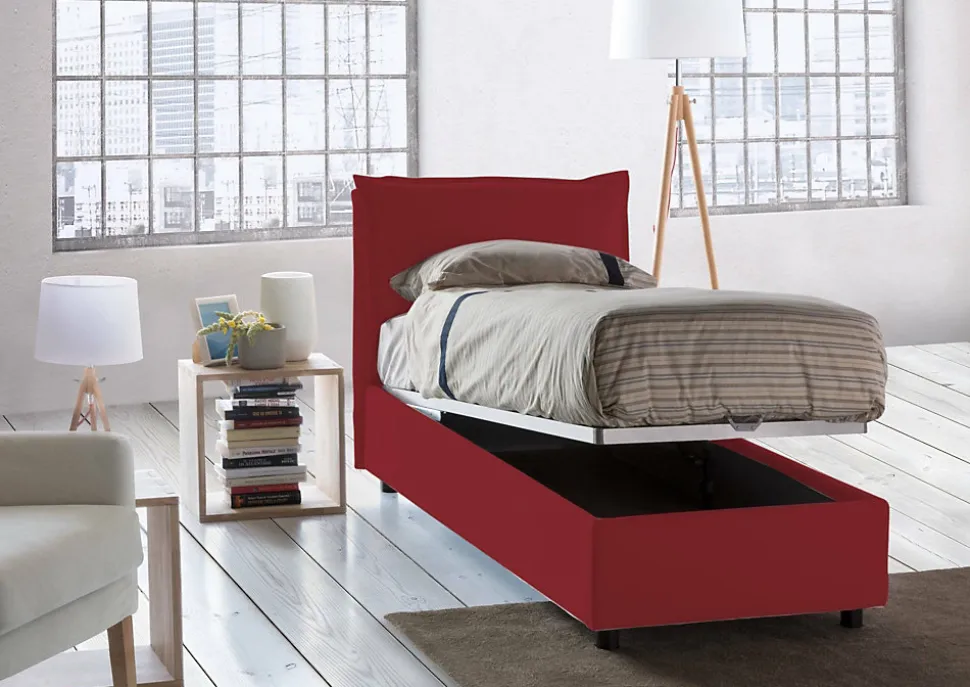 LIT SIMPLE – Lit coffre avec revêtement en tissu, 100% Made in Italy, Ouverture frontale, adapté pour matelas 90×190 cm, Rouge. STRUCTURE – La structure du lit est en fibre de bois surélevée du sol avec des pieds en ABS et est recouverte de tissu polyester doux, déhoussable et lavable en machine à 30° – La tête de lit linéaire assortie en tissu avec coutures apparentes est solide et résistante – Le sommier à lattes en contreplaqué est inclus dans la structure – Mécanisme d’ouverture en fer – L’ajout de la boîte de rangement pratique et peu encombrante permet de transformer le lit en un coffre spacieux pour les draps, les oreillers et les couettes. MADE IN ITALY – L’article est produit en Italie, avec l’utilisation des meilleurs matériaux et la plus haute qualité et attention aux détails – Le soin des processus de production est synonyme de fiabilité, de résistance et de raffinement – Made in Certification Italy est une garantie de pleine conformité avec la réglementation de l’Union européenne. ASSEMBLAGE – Le montage est simple et rapide: grâce aux outils de montage fournis en kit avec le produit et le livret d’instructions vous pourrez assembler votre produit en quelques minutes – Article certifié OekoText. MESURES ET OUVERTURE – Dimensions du lit: Longueur 205 x Largeur 105 x Hauteur 95 cm (hauteur du sommier depuis le sol: 32cm) – Ouverture du conteneur: avant – Profondeur du conteneur: 20 cm environ – Hauteur des pieds: 10 cm environ – Fond de lit en mélamine d’une épaisseur de 1 cm – Convient pour matelas de taille: 90×190 cm – Matelas non inclus