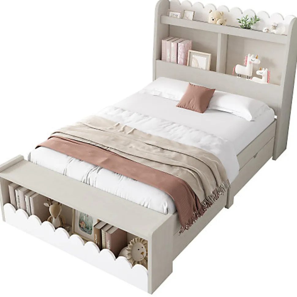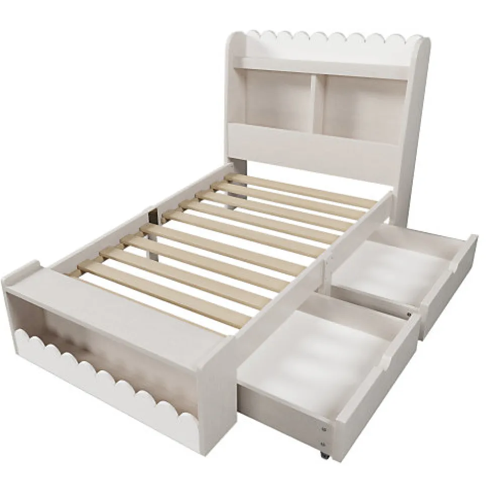 •【Conception exclusive】Le lit est conçu en blanc et en grain de bois, montrant une beauté fraîche et naturelle sans perdre sa simplicité. La décoration unique en forme de vague rend la chambre des enfants vivante et vivante, rendant toute la pièce pleine d’intérêt enfantin.•【2 tiroirs】Le lit est équipé de deux tiroirs de 50 cm de profondeur qui peuvent être installés de manière flexible sur le côté gauche ou droit selon la disposition de la pièce. Les tiroirs sont équipés de poignées squelettes incurvées et sont conçus avec des rouleaux sur le fond pour un déplacement facile.•【Conçu pour la lecture】Il y a des étagères de 13 cm de profondeur à la tête et au pied du lit, où peuvent être placés des livres pour enfants, des réveils, des bibelots et d’autres objets. Le tabouret de bout de lit a une capacité portante et les livres sont placés en bas, ce qui le rend très pratique à lire pour les enfants.•【Structure de cadre stable】Le cadre de lit est en bois massif pour assurer la stabilité. Grâce à une structure encastrée, le matelas est fermement placé sur le lit pour assurer la sécurité de l’enfant pendant son sommeil et améliorer le confort de sommeil de l’enfant. L’épaisseur du matelas recommandée est de 15 cm.