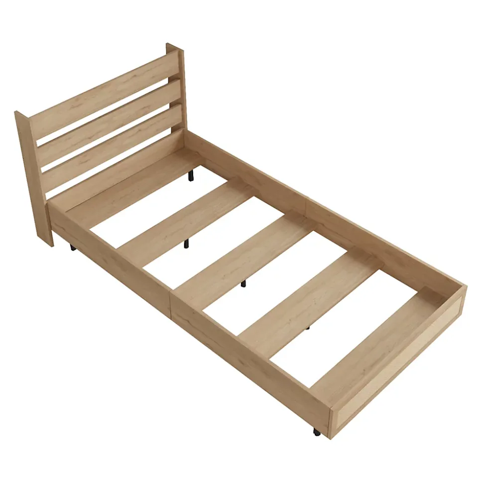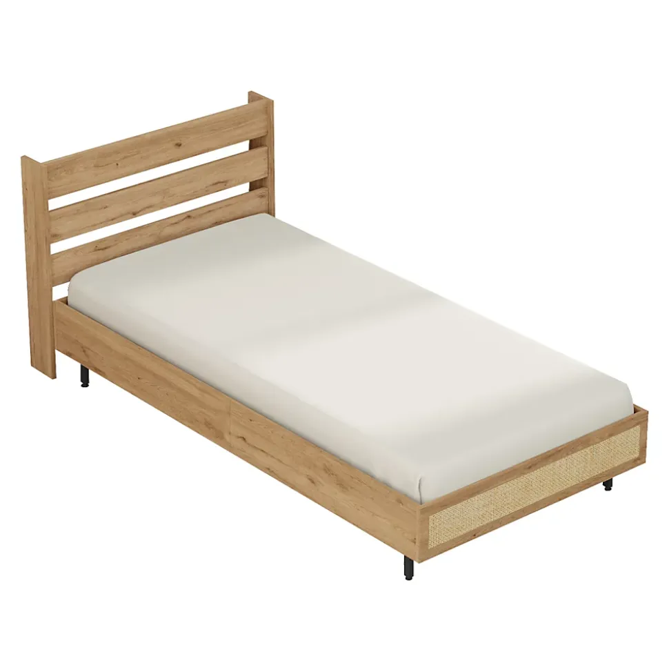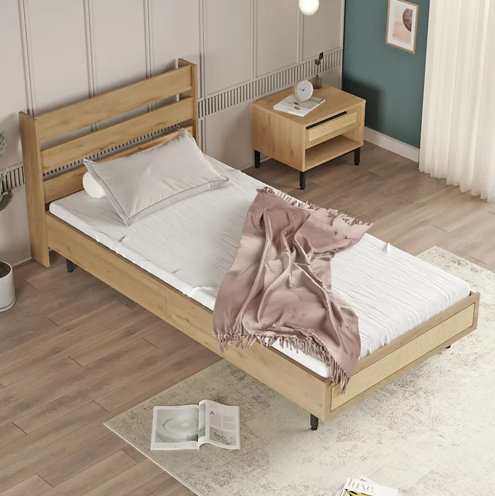 - Design Élégant et Polyvalent : Ce lit simple allie élégance et simplicité, avec un cadre en effet chêne et une façade de pied de lit en aspect rotin, s’intégrant parfaitement dans n’importe quel style de décoration, du moderne au classique.