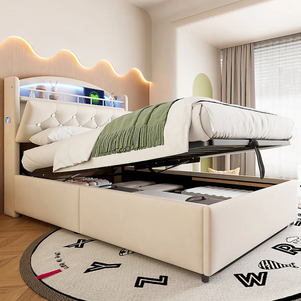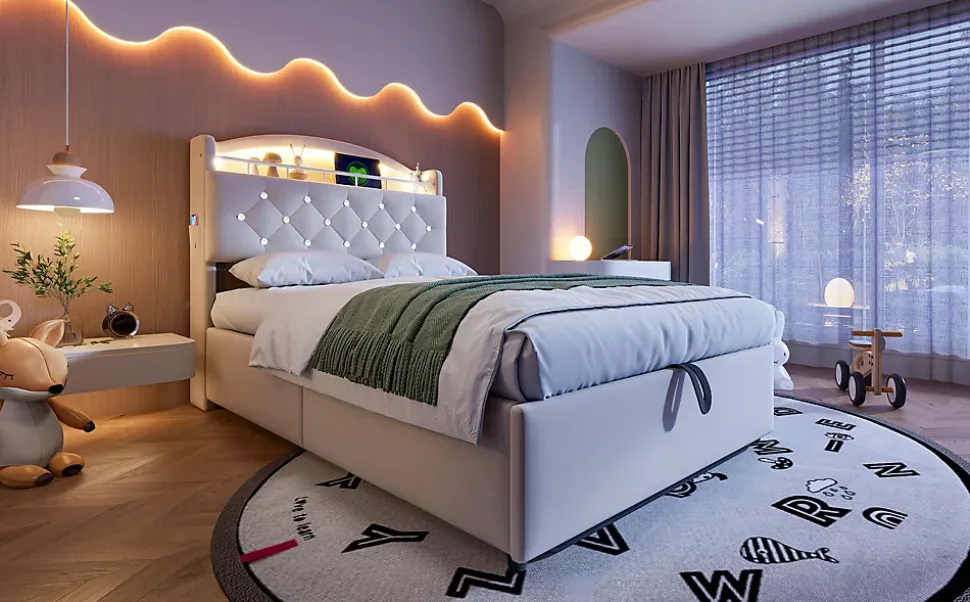 Lit coffre polyvalentGrand espace de rangement sous le lit avec un mécanisme hydraulique facile à utiliser pour garder la chambre bien ordonnée. Des rangements latéraux pratiques intégrés permettent de stocker de petits objets, alliant ainsi fonctionnalité et style.Design technologique et moderneLa tête de lit est ornée de losanges en plastique et équipée d’une bande LED multicolore créant une atmosphère amusante et dynamique. Dispose également de 3 ports USB et d’un port Type-C pour recharger vos appareils facilement depuis le lit.Structure robuste et stableLe design à larges pieds de chaque côté de la tête de lit améliore la stabilité et empêche tout balancement, assurant un sommeil sûr et confortable.Lattes métalliques solidesLes lattes en métal offrent une excellente stabilité et un soutien durable, garantissant une longue durée de vie. La capacité de charge atteint jusqu’à 200 kg.Tissu doux et élégantRevêtu d’un tissu en velours doux et agréable au toucher, disponible en beige, gris et rose, pour s’adapter harmonieusement à la décoration de votre chambre.