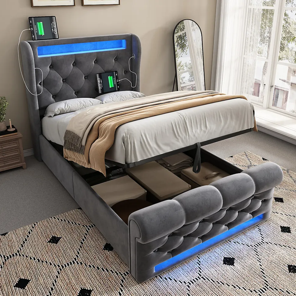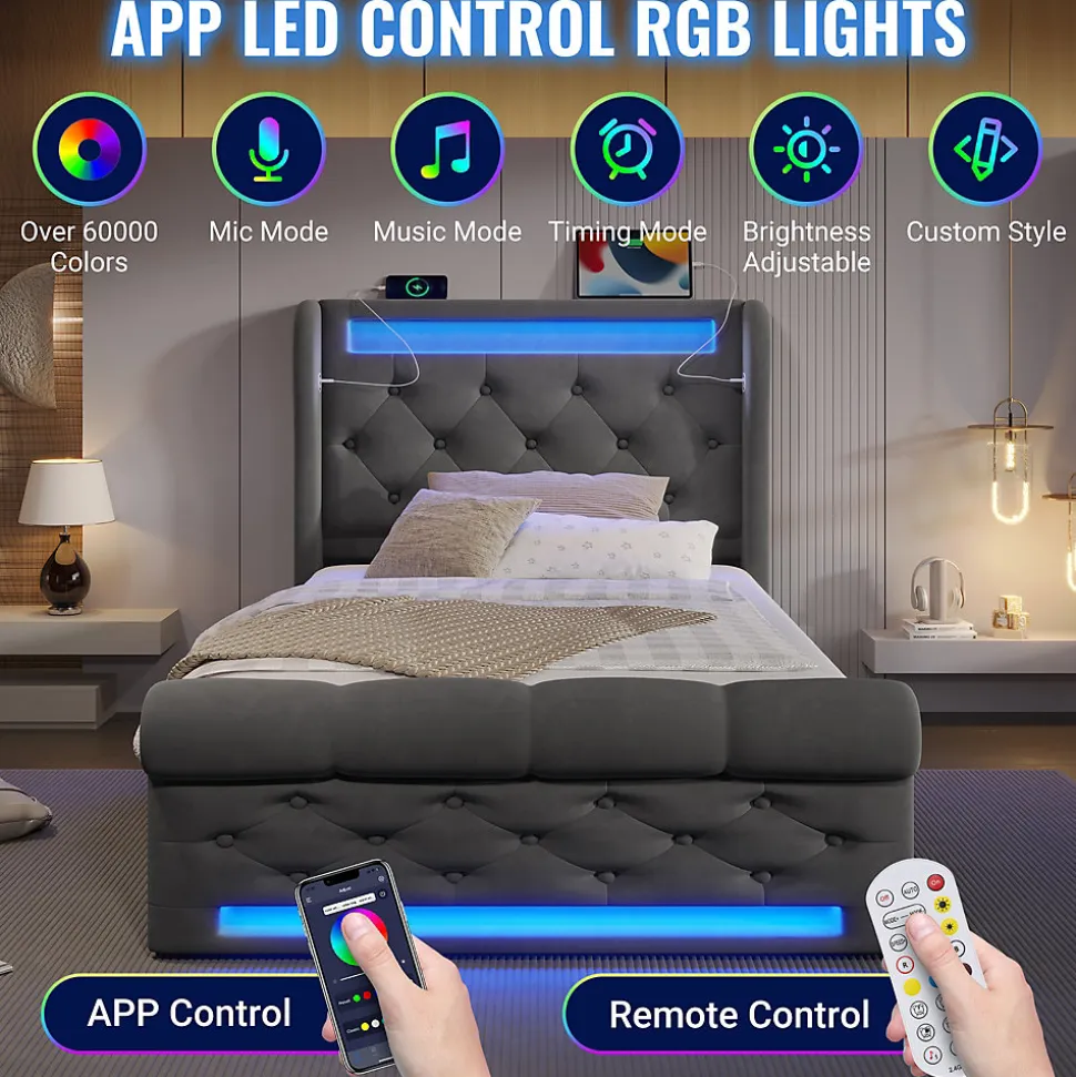 【Design classique et élégant 】: Lit hydraulique avec housse en velours doux. Forme élégante avec côtés de tête de lit profilés et pied de lit cylindrique.【Bande lumineuse LED innovante et polyvalente】 : les bandes lumineuses LED intégrées à la tête et au pied du lit prennent en charge des minuteries et différents modes d’éclairage dynamiques. Vous pouvez choisir parmi plus de 60couleurs de lumière via une application ou une télécommande, et les lumières peuvent même clignoter au rythme de la musique.【Station de recharge pratique】 : On retrouve une station de recharge ronde USB + Type C de chaque côté du lit. Le fait que vous ou votre famille puissiez recharger vos appareils électroniques à tout moment sans avoir à quitter le lit apporte un grand confort à la vie quotidienne moderne.【Le design fonctionnel est surprenant】 : la partie pieds est équipée d’un cordon de traction pour ouvrir facilement l’espace de rangement sous le lit hydraulique ; le sommier est équipé d’un chiffon anti-poussière. Les barres de fer de la tête de lit et les rainures latérales assurent la stabilité du matelas. 【Remarque】 : le cadre de lit ne contient pas de matelas. Le cadre de lit est livré avec des outils de montage simples et des instructions de montage détaillées. Pour minimiser les risques de dommages, le cadre de lit est expédié en deux lots et peut arriver à des jours différents. Dimensions totales : 96 x 220 x 110 cm (LxLxH)Matériau du panneau : veloursCouleur:Beige/grisMatelas applicable (matelas non inclus) : 90 × 200 cmÉpaisseur de matelas recommandée : 20-25 cmPoids maximum de l’utilisateur : 150 KG / 330 LBSSommier tapissier requis : AucunAssemblage requis : OuiContenu de l’emballage : cadre de lit + LED + station de rechargeQuantité du colis : 2Poids brut/poids net : 45 KG / 39,95 KGDesign unique : LED intégrées en tête et pied de litChargement : Type USB + Type C