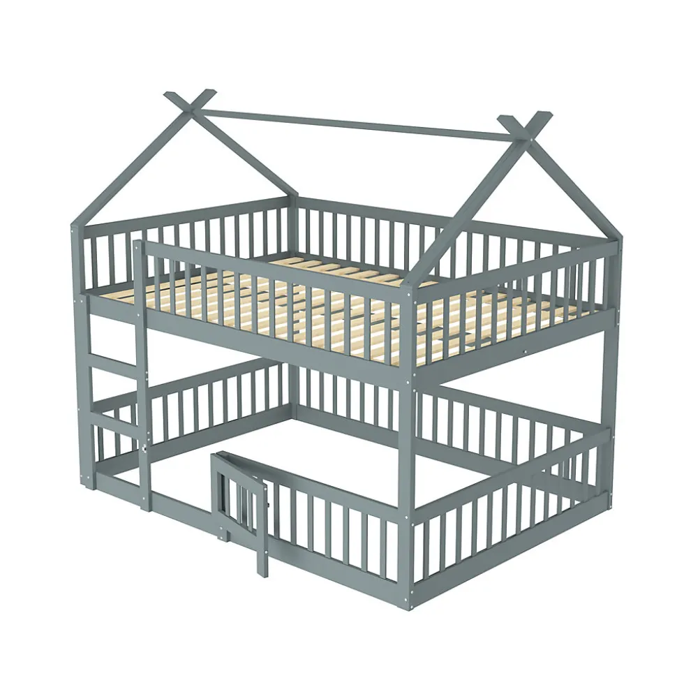 Design & styleCe lit superposé à l’esprit loft se distingue par une silhouette haute et basse et une finition gris classique qui s’intègre aisément dans une chambre familiale ou enfant. L’esthétique sobre permet une combinaison avec différents décors et crée un coin nuit élégant et fonctionnel.Fonctions & usagesConçu pour optimiser l’espace, le couchage supérieur libère la zone inférieure qui peut servir d’aire de repos, de jeu ou de coin lecture. Le lit inférieur est doté d’une porte ouvrante pour plus d’attrait et de modularité, offrant plusieurs configurations selon les besoins de la chambre.Sécurité & accessibilitéBarrières hautes sur les deux niveaux pour garantir une zone de sommeil protégée. L’échelle intégrée permet un accès confortable et sécurisé au lit supérieur. Capacité d’utilisation adaptée aux activités enfantines avec une charge maximale indiquée de 120 kg.Matériaux & entretienStructure en bois massif associée à éléments en métal, contreplaqué et panneaux MDF pour une stabilité accrue. 14 lattes incluses pour le couchage. Surfaces faciles à nettoyer : essuyer avec un chiffon doux et produit non agressif si nécessaire.Dimensions, couchage & montageCouchage recommandé : 140×200 cm (matelas non inclus, épaisseur recommandée 12-15 cm). Dimensions totales approximatives : 205x145x205 cm. Poids produit 46,7 kg, poids total colis 51,7 kg, livré en 2 colis. Montage complet requis, deux personnes conseillées ; outils fournis, temps estimé 2 heures.