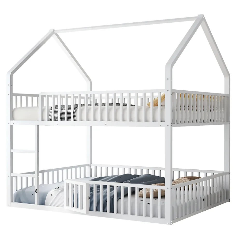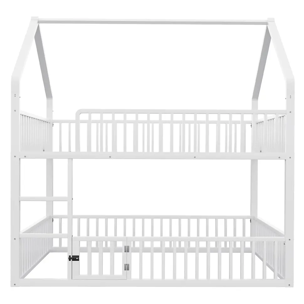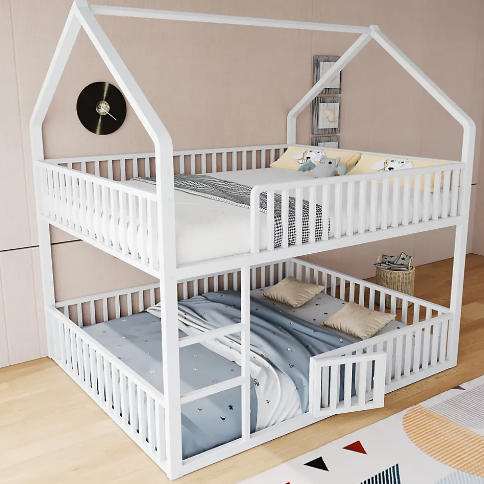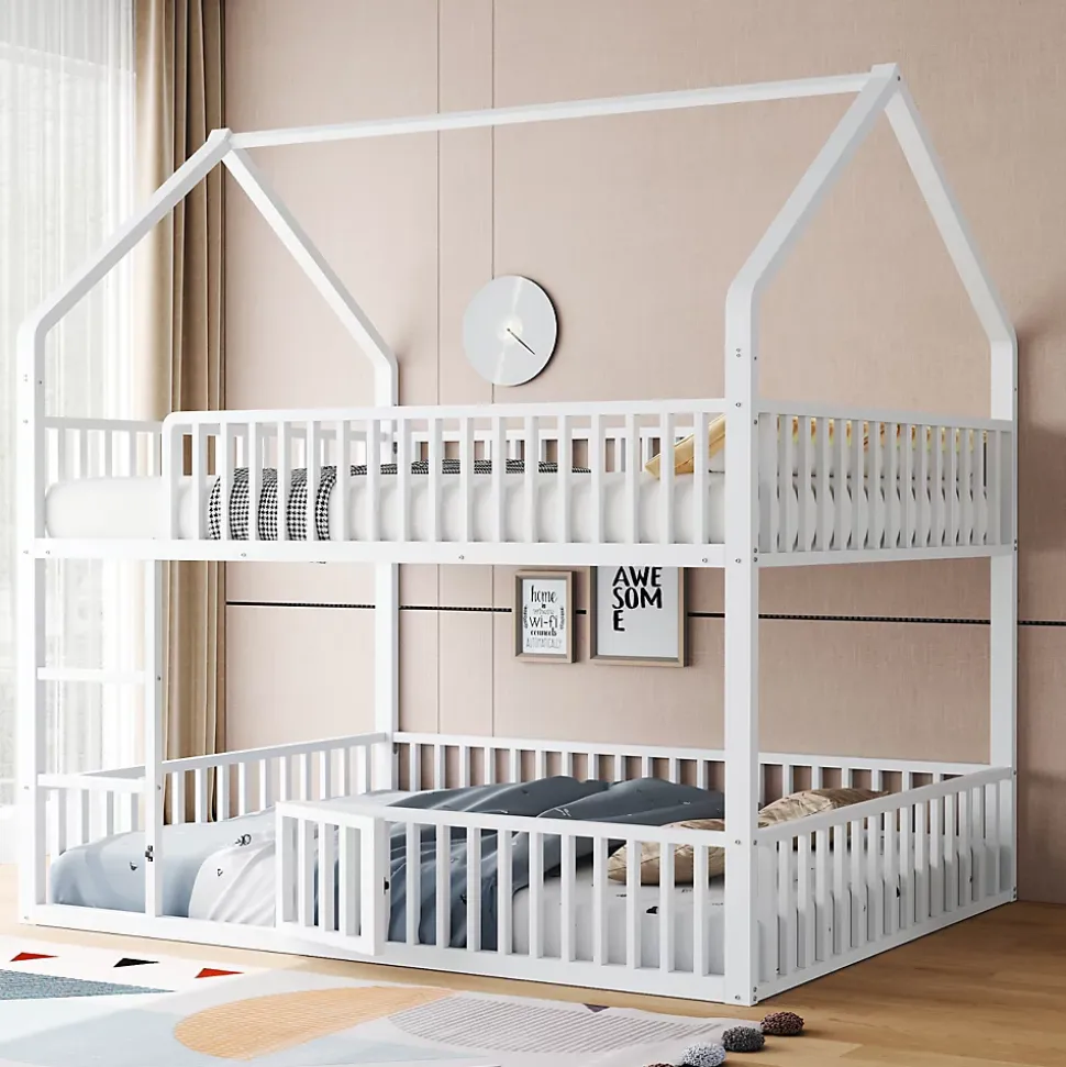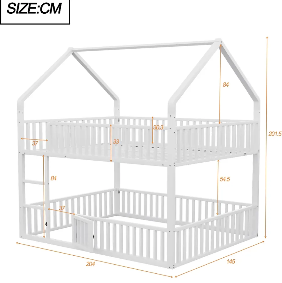 Design & style Ce lit superposé adopte un cadre en forme de maison pour stimuler l’imaginaire des enfants tout en conservant une esthétique sobre et contemporaine. La finition blanche offre une intégration facile dans une chambre d’enfant, d’ado ou un espace familial.Fonctionnalités & agencement Lit supérieur conçu comme espace de couchage avec sommier métallique à lattes pour un maintien stable. Lit inférieur aménagé en coin polyvalent avec petite porte ouvrante : espace de repos, lecture ou jeu modulable selon les besoins. Garde-corps tout autour et échelle frontale permettant un accès sûr et direct au couchage supérieur.Matériaux & sécurité Structure robuste en métal assurant stabilité et longévité, disponible en blanc ou noir. Les garde-corps sur les deux niveaux renforcent la sécurité d’utilisation ; capacité de charge indiquée à 120 kg. Surfaces faciles à entretenir avec un chiffon humide.Dimensions & spécifications Dimensions totales : 204x145x201,5 cm. Dimensions couchage : 140×200 cm. Nombre de lattes : 20. Épaisseur de matelas recommandée : 8-12 cm. Poids net du produit : environ 47 kg, poids total des colis : 51 kg. Disponible également en 90×200 cm selon modèle.Installation & livraison Montage complet requis, environ 2 heures ; deux personnes conseillées. Produit livré en 2 colis avec notice et pièces numérotées, outils de base fournis ; il est recommandé d’éviter l’usage d’outils électriques pour l’assemblage. Convient aux enfants, adolescents et petits foyers à la recherche d’une solution multifonctionnelle.