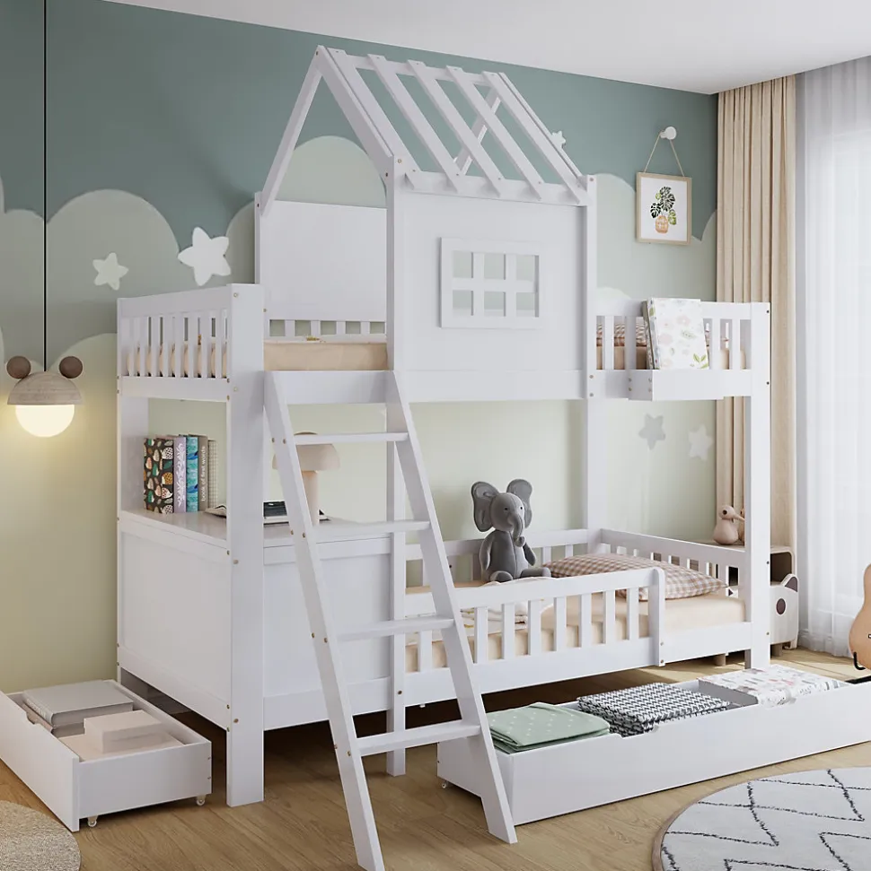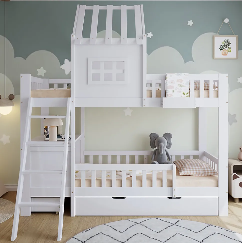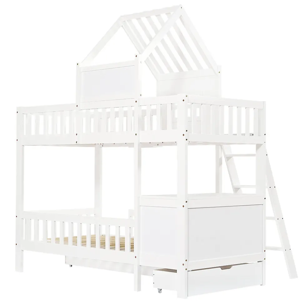 Lit superposé fonctionnel avec rangements et toit décoratif, Bois + MDF + Contreplaqué, Blanc, 90x200cmCe lit superposé allie fonctionnalité, confort et design charmant. La structure à étages offre non seulement un espace de sommeil, mais aussi des possibilités d’utilisation supplémentaires. Deux tiroirs à roulettes sous le lit permettent de ranger vêtements, jouets ou linge de manière pratique et ordonnée. Le lit supérieur dispose d’un petit panier de rangement pour garder livres, objets ou boissons à portée de main.Un beau toit et des fenêtres intégrées donnent au lit un aspect maison chaleureux, stimulant l’imagination et créant une atmosphère accueillante. Le lit inférieur est équipé d’un bureau pour lire, dessiner ou jouer, optimisant l’espace disponible. La petite échelle à quatre marches assure un accès sécurisé au lit supérieur, pratique et stable.Fabriqué en bois de pin, MDF et contreplaqué, le lit offre solidité et durabilité pour une utilisation prolongée. Avec ses dimensions de 90×200 cm et sa finition blanche, il s’intègre facilement à différents styles de décoration intérieure. L’assemblage est simple grâce aux instructions détaillées et à toutes les pièces fournies, rendant le montage agréable et rapide.Un lit superposé pratique et esthétique, qui maximise l’espace tout en créant une ambiance chaleureuse et ludique dans la chambre.