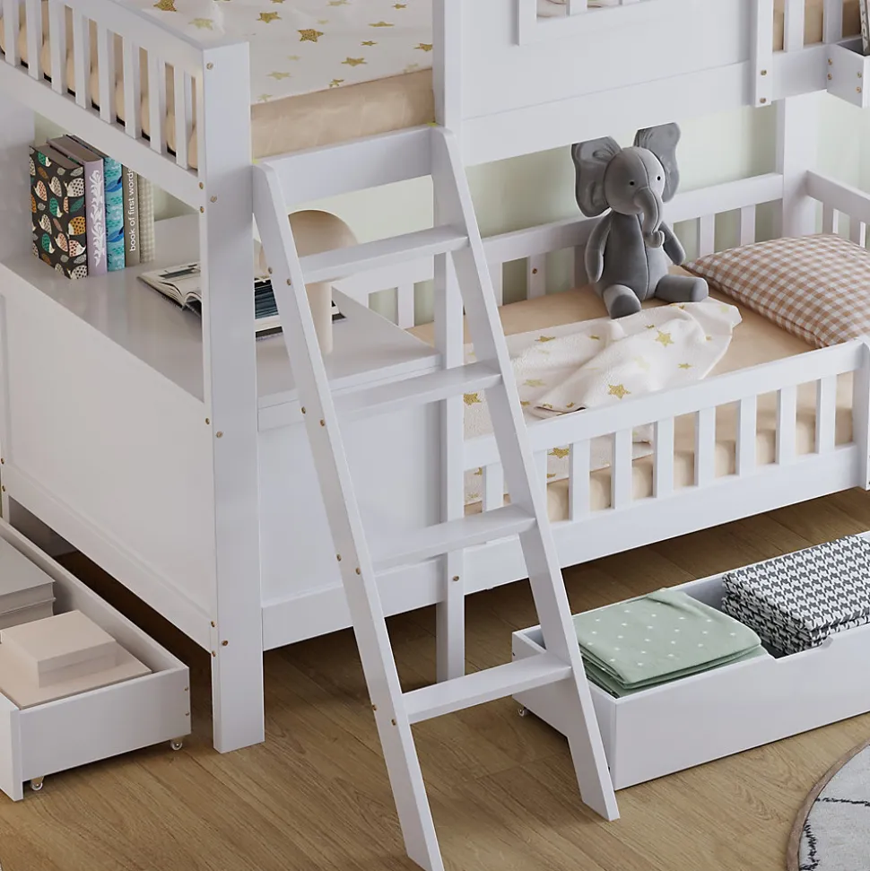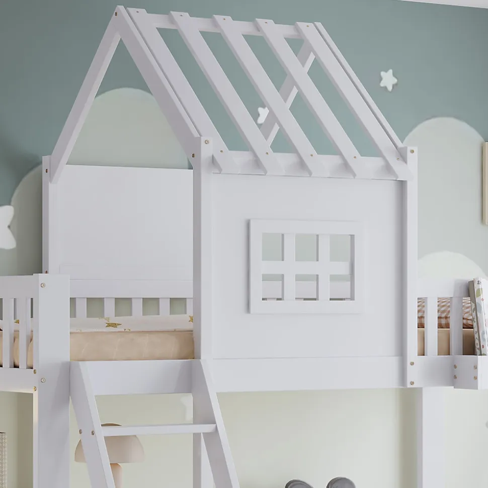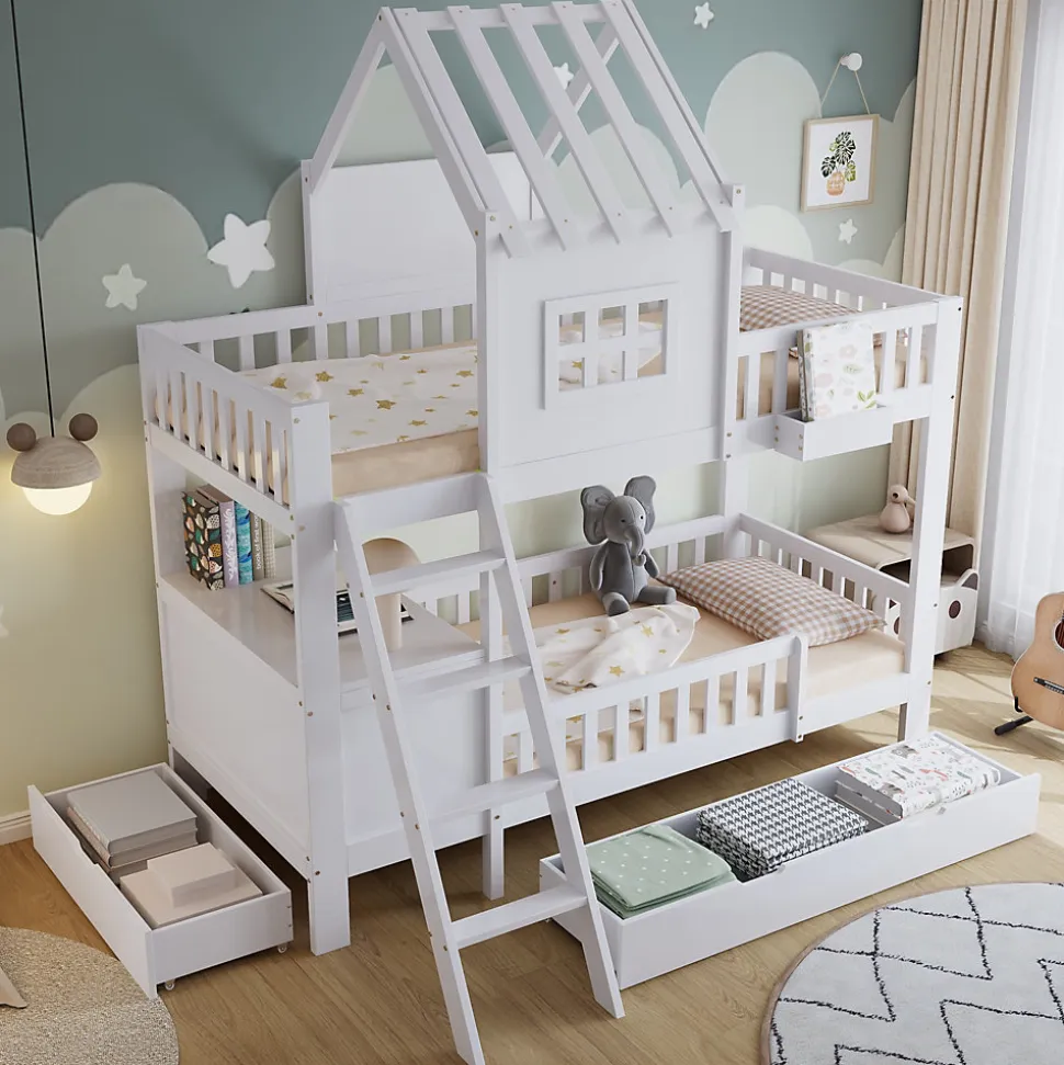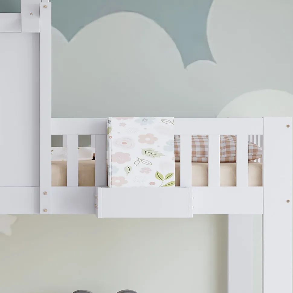Lit superposé fonctionnel avec rangements et toit décoratif, Bois + MDF + Contreplaqué, Blanc, 90x200cmCe lit superposé allie fonctionnalité, confort et design charmant. La structure à étages offre non seulement un espace de sommeil, mais aussi des possibilités d’utilisation supplémentaires. Deux tiroirs à roulettes sous le lit permettent de ranger vêtements, jouets ou linge de manière pratique et ordonnée. Le lit supérieur dispose d’un petit panier de rangement pour garder livres, objets ou boissons à portée de main.Un beau toit et des fenêtres intégrées donnent au lit un aspect maison chaleureux, stimulant l’imagination et créant une atmosphère accueillante. Le lit inférieur est équipé d’un bureau pour lire, dessiner ou jouer, optimisant l’espace disponible. La petite échelle à quatre marches assure un accès sécurisé au lit supérieur, pratique et stable.Fabriqué en bois de pin, MDF et contreplaqué, le lit offre solidité et durabilité pour une utilisation prolongée. Avec ses dimensions de 90×200 cm et sa finition blanche, il s’intègre facilement à différents styles de décoration intérieure. L’assemblage est simple grâce aux instructions détaillées et à toutes les pièces fournies, rendant le montage agréable et rapide.Un lit superposé pratique et esthétique, qui maximise l’espace tout en créant une ambiance chaleureuse et ludique dans la chambre.