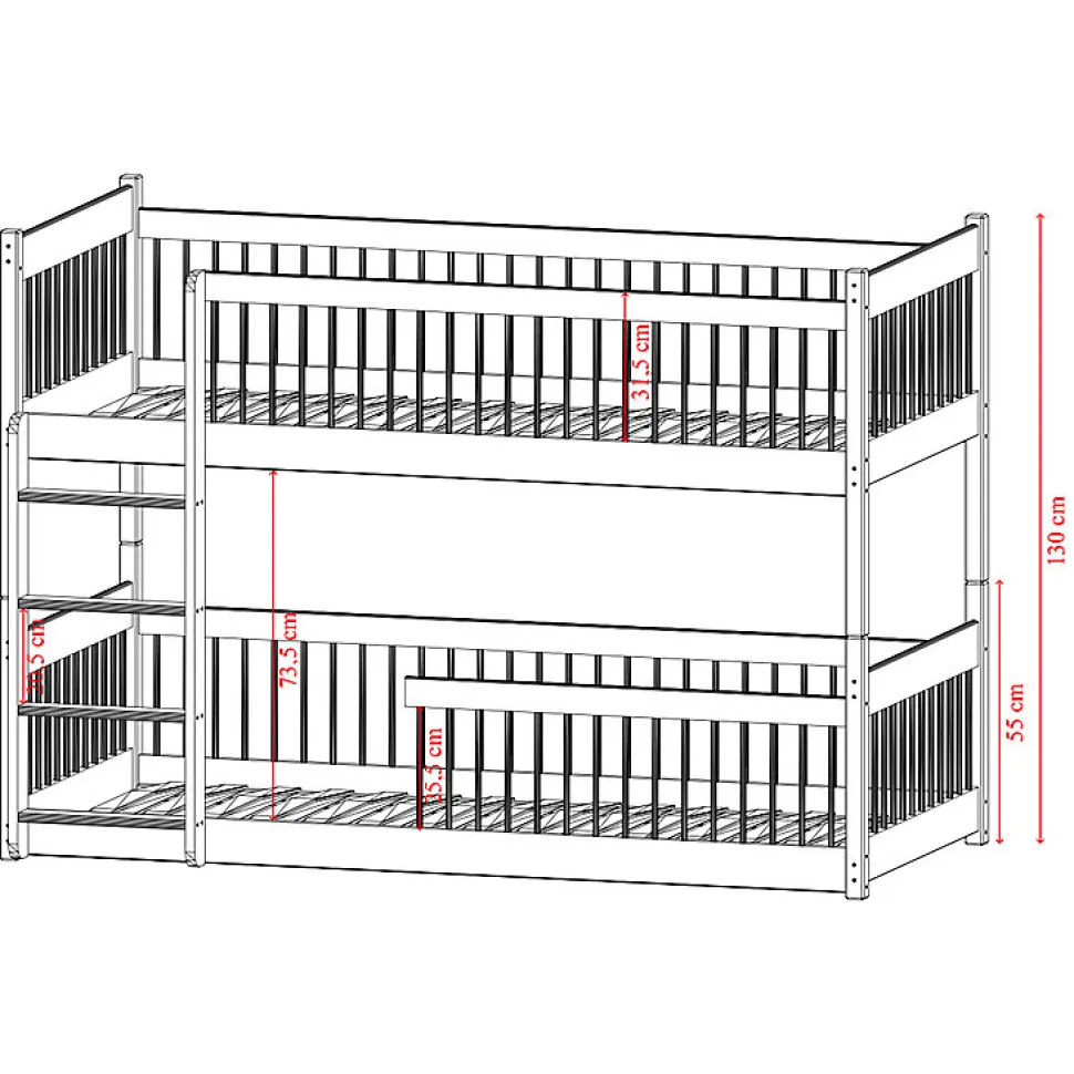- Caractéristiques : A partir de 6 ans pour le lit du haut – Sommiers à lattes inclus – Poids maximum conseillé : 100 kg – Hauteur maximale conseillée pour les matelas : 13 cm vendus séparément – Hauteur sous le lit supérieur : 75 cm environ – Barrière fixe incluse – Possibilité de monter l’échelle à droite ou à gauche – Peut être transformé en 2 lits séparés