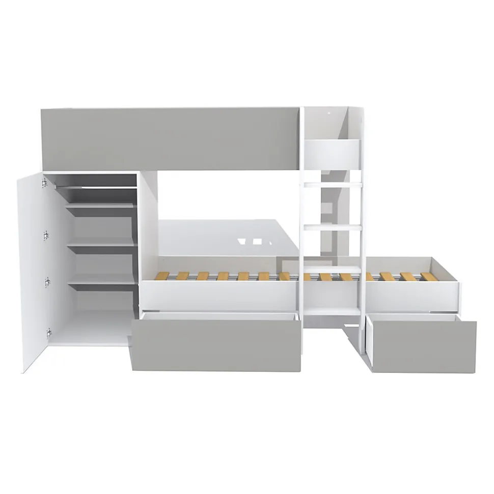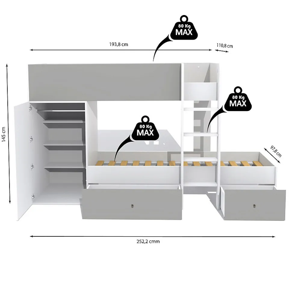 Ce lit superposé est non seulement recherché, mais également apprécié pour son efficacité dans l’optimisation de l’espace. Il est comme la solution idéale pour partager une chambre à coucher tout en maximisant l’espace disponible.Pratique, chacun des lits possèdent des tiroirs de rangement et 1 armoire intégrée avec 1 penderie et 3 tablettes.Matériel:- Structure en panneau de particules.- Echelle non réversible- 2 sommiers à 14 lattes en épicéa- 2 tiroirs de rangement et armoire intégrée avec 1 penderie et 3 tablettes.Dimensions:Zone de couchage 90x190cmLongueur:252cmLargeur : 111 cm Hauteur : 146cmPetit(s) tiroirs : 56 x 29 x 49 cm – Intérieur 52 x 18 x 46 cmGrand(s) tiroirs : 94 x 29 x 49 cm – Intérieur 90 x 18 x 46 cmPrécautions à prendre:* Age minimum d’utilisation : 6 ans* Charge maximale d’utilisation:80 kg* Hauteur maximale de matelas conseillée : 14 cmATTENTION le matelas et la décoration ne sont pas comprise dans la livraison*Les couleurs réelles peuvent différer de ceux indiqué dans l’image en raison de la nature des paramètres de couleur de photographier et de moniteur.Support client et SAV en Français – Pas de livraison dans le DOM TOM et la Corse.**Attention la livraison est prévue au pied de l’immeuble ou de la maison et non à domicile.