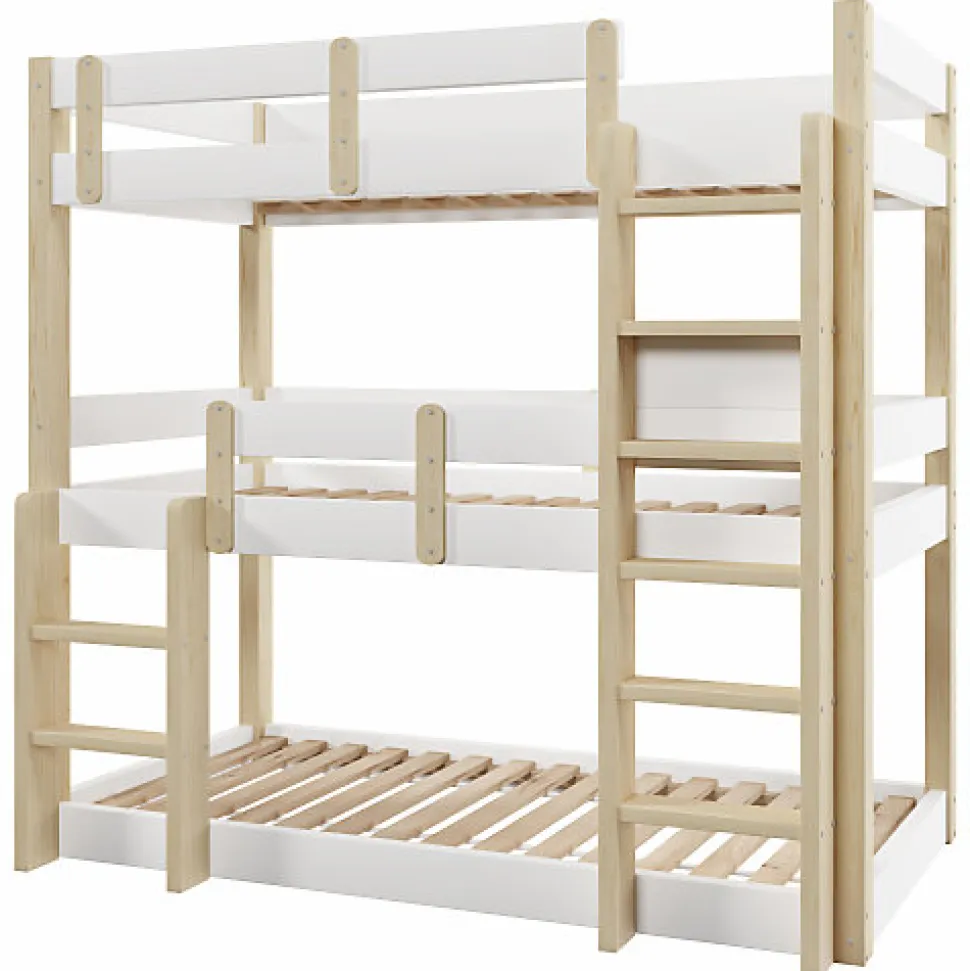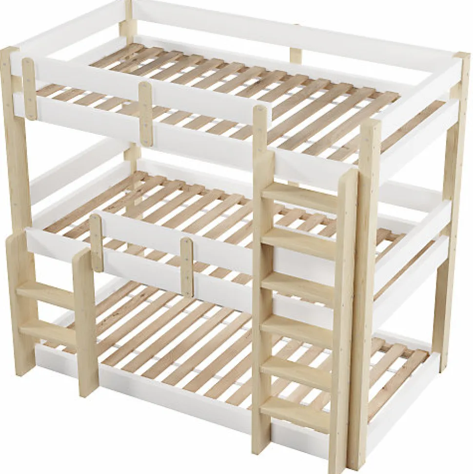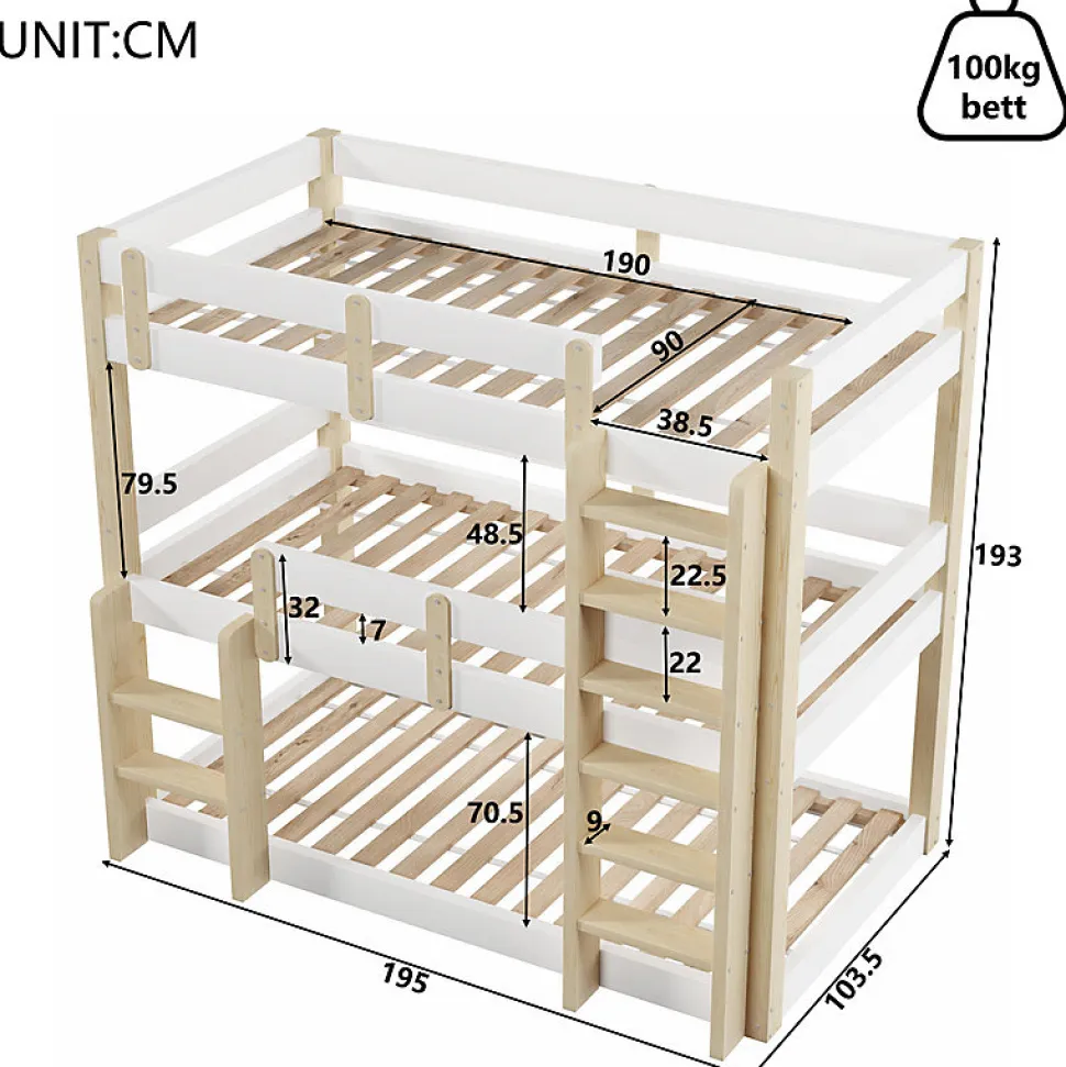 •【Cadre en bois massif de qualité supérieure】Fabriqué en bois massif de qualité supérieure et en panneaux de fibres de moyenne densité (MDF), ce lit superposé est robuste et durable, offrant une grande capacité de charge et contribuant à la croissance saine des enfants.•【Barrières de sécurité surélevées】Chaque lit superposé est équipé de barrières de sécurité surélevées. L’espacement étudié empêche efficacement les enfants de tomber lorsqu’ils dorment ou jouent.•【Style minimaliste】Grâce à son design minimaliste, ce lit superposé triple s’intègre harmonieusement à différents styles d’intérieur. Il convient aux résidences étudiantes, aux appartements et aux chambres d’enfants.•【Double échelle pour plus de sécurité et de praticité】Les échelles antidérapantes de chaque côté facilitent l’entrée et la sortie du lit, s’adaptant ainsi à différentes configurations de pièces et répondant aux besoins des enfants de différentes capacités.•【Trois couchages】Ce lit superposé peut accueillir confortablement trois personnes, ce qui en fait un choix idéal pour les familles nombreuses ou pour celles qui reçoivent régulièrement des proches. L’utilisation optimale de l’espace vertical permet d’aménager les petites chambres.•【Facile à assembler】Des instructions détaillées et des pièces complètes sont disponibles pour vous aider à réaliser l’assemblage rapidement.