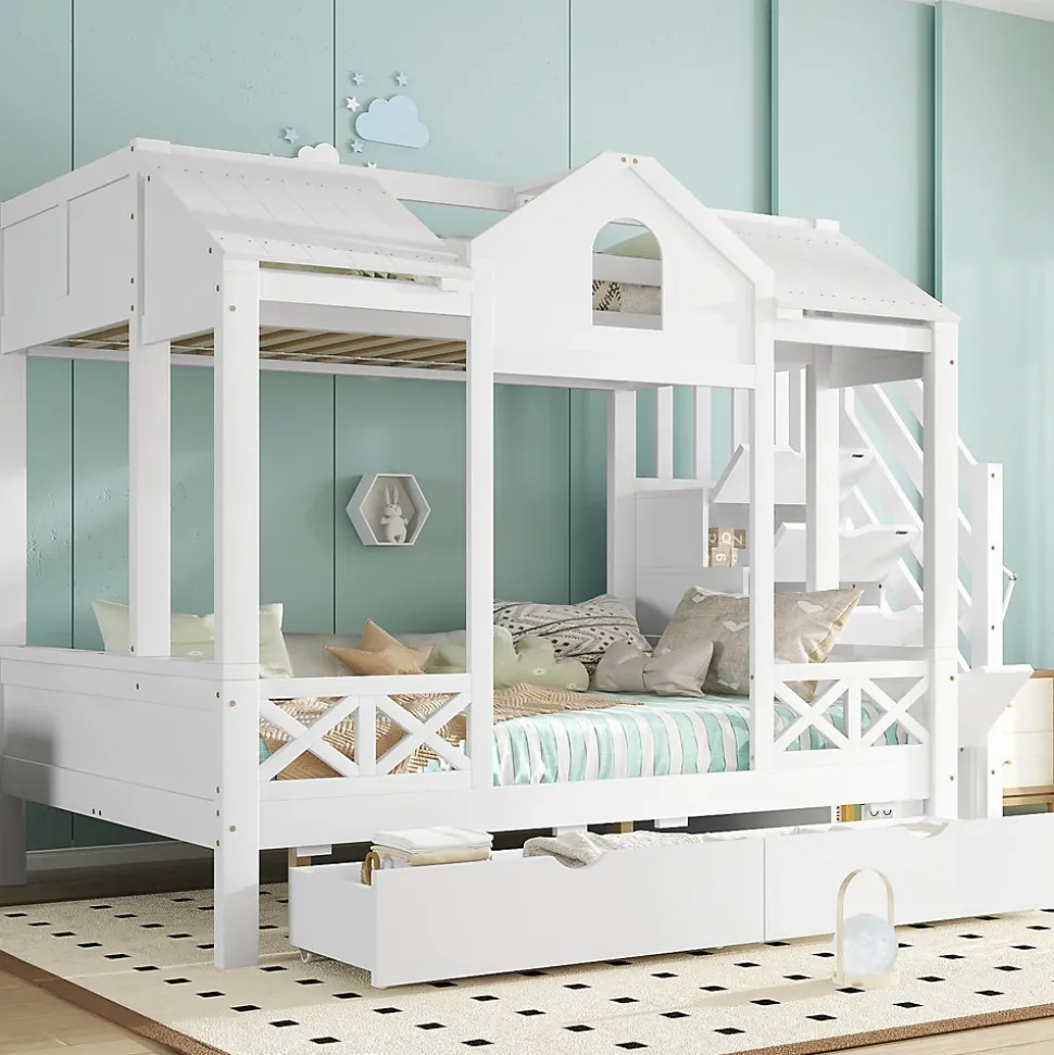 Design & styleCe lit superposé adopte un style maisonnette avec fenêtres et toit, offrant un espace de jeu et de sommeil intégré. Sa finition blanche sobre permet une intégration facile dans une chambre enfant, moderne ou minimaliste.Fonctionnalités & rangementDeux tiroirs coulissants sur roulettes pour jouets, linge ou livres, faciles à manipulerMeuble d’escalier avec 4 niches de rangement pour organiser les petites affairesDisponible en 90×200 cm ou 140×200 cm pour s’adapter à l’âge et à la taille de la chambreMatériaux & entretienStructure en pin, panneaux MDF et lattes en contreplaqué pour une construction stable et durable. Finition blanche facile d’entretien : nettoyer avec un chiffon doux et un détergent doux si besoin.Dimensions & capacitéDimensions extérieures : 254,5x145x170 cm (selon configuration)Dimensions couchage compatibles : 90×200 cm et 140×200 cm (matelas non inclus, épaisseur ≤11 cm)Distance entre les couchages : 112 cm. Capacité de charge recommandée : 120 kg. Poids total : environ 126 kg.Installation & livraisonMontage requis, notice fournie et pièces complètes. Deux personnes sont recommandées pour un assemblage sûr. Livré en 5 colis pouvant arriver séparément, prévoir un contrôle à la réception.