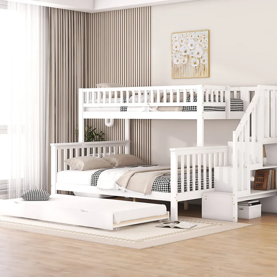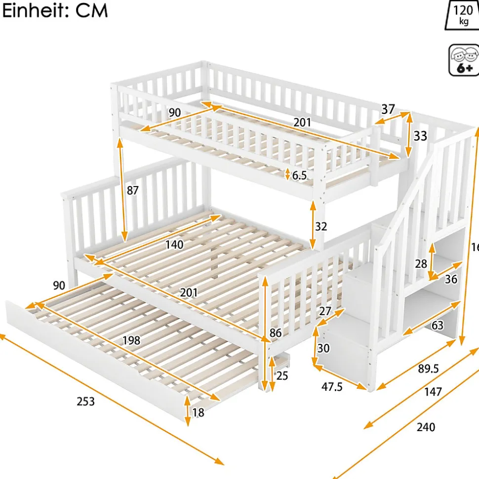Design & styleCe lit superposé présente un design sobre et fonctionnel en blanc, conçu pour s’intégrer discrètement dans une chambre enfant ou ado. Les lignes épurées et la finition blanche conviennent à divers styles d’aménagement tout en offrant une apparence lumineuse.Fonctionnalités & rangement Deux couchages distincts 90×200 cm (partie haute) et 140×200 cm (partie basse) pour une organisation flexible de la chambre. Échelle intégrée avec espaces de rangement et plusieurs niches en bout de lit pour garder les essentiels à portée de main. Lit gigogne coulissant 90×190 cm inclus, utilisable pour les nuits d’invités et se range sans encombrer la pièce.Dimensions & couchagesDimensions totales approximatives du meuble : 253x240x160 cm. Intérieur couchage : 90×200 cm (haut) et 140×200 cm (bas). Lit gigogne intérieur : 90×190 cm. Capacité de charge : 120 kg par niveau principal, 80 kg pour le lit gigogne. Nombre de lattes : 15 pièces. Épaisseur de matelas recommandée : 10–15 cm pour le lit supérieur, 15–20 cm pour le lit inférieur, 10 cm pour le gigogne.Matériaux & entretienStructure en pin massif complétée par éléments en MDF pour une stabilité renforcée. Finition blanche facile à entretenir : nettoyer avec un chiffon doux et un détergent neutre si nécessaire. Éviter les produits abrasifs pour préserver la surface.Installation & livraisonProduit livré en 4 colis depuis l’entrepôt ; les colis peuvent arriver à des dates différentes. Montage requis, deux personnes recommandées. Mesures fournies à titre indicatif, tolérance de 2–3 cm. Pour toute question d’installation, contacter le service client.
