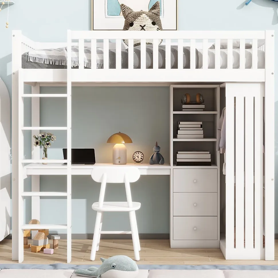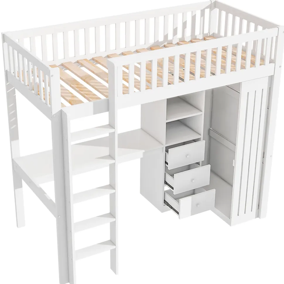 - Agencement optimisé avec bureau intégré pour le travail, armoire ouverte et 3 tiroirs volumineux pour le rangement, échelle et garde-corps intégrés garantissant un accès pratique et sécurisé.