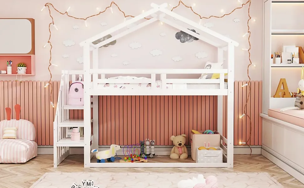 Design & polyvalenceCe lit superposé reprend l’esthétique « maison » appréciée des enfants et propose un concept ouvert : le couchage inférieur peut servir de lit mais aussi d’aire de jeu ou de coin détente. La finition blanche, sobre et contemporaine permet d’intégrer facilement le meuble dans une chambre enfant ou ado tout en optimisant l’espace au sol.Fonctionnalités & rangement Échelle de sécurité à deux marches qui facilite l’accès et sert également de rangement grâce à ses étagères intégrées, pratique pour jouets et livres. Configuration modulable : possibilité d’aménager l’espace inférieur avec tiroirs ou libre pour répondre aux besoins du quotidien. Sommier à 16 lattes inclus, conçu pour un soutien régulier ; le lit supérieur ne nécessite pas de structure supplémentaire.Sécurité & matériauxBarrières de sécurité de 29 cm sur le pourtour du lit supérieur pour limiter les chutes. Cadre robuste associé à des pieds en pin massif et des panneaux en contreplaqué/MDF pour une stabilité et une durabilité accrues. Charge maximale recommandée : 120 kg par couchage.Dimensions & couchageDimensions totales : 225 x 95 x 221 cm. Dimensions de couchage : 90 x 200 cm. Épaisseur de matelas recommandée : 8-12 cm (matelas non inclus). Nombre de lattes : 16. Poids total colis : environ 60 kg. Coloris disponible : blanc (également proposé en gris clair selon modèle).Installation & emballageMontage complet requis ; durée estimée 1 heure avec deux personnes recommandées. Visserie et outils essentiels fournis, l’usage d’outillage électrique est déconseillé. Produit livré en 3 colis pouvant arriver séparément ; vérifier l’intégrité de chaque colis à la réception et suivre le manuel de montage fourni.