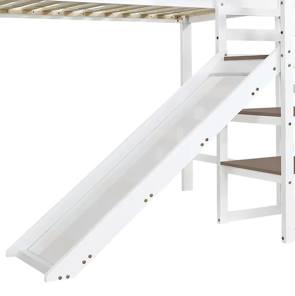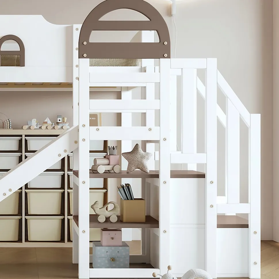 Design ludique avec fenêtres décoratives : Le lit présente deux fenêtres décorées de manière créative, ajoutant une touche de fantaisie tout en rendant le lit plus attrayant et amusant pour les enfants.Rangement pratique avec escaliers : L’échelle inclinée est équipée de deux placards de rangement, parfaits pour les jouets, les vêtements et autres accessoires. Ces espaces de rangement intégrés permettent de garder la chambre organisée.Toboggan intégré : Le lit dispose d’un toboggan en PP lisse et résistant à l’usure, conçu pour permettre aux enfants de descendre en toute sécurité tout en s’amusant. Le design doux et incliné garantit la sécurité tout en apportant une touche ludique à l’espace.Sécurité renforcée : Le lit supérieur est entouré de grilles de sécurité sur les quatre côtés, garantissant que votre enfant ne risque pas de tomber durant son sommeil.Certifié pour la sécurité : Ce lit est conforme aux normes de sécurité européennes , assurant sa stabilité et sa durabilité. Il a été rigoureusement testé pour garantir une sécurité optimale.Installation facile : Le lit est livré avec des instructions détaillées et toutes les pièces nécessaires pour un montage simple et rapide.Dimensions et spécifications :Dimensions totales : 257x146x145 cmPoids total : 45,5 kgDimensions de matelas compatibles : 90×200 cm (épaisseur du matelas ≤ 13 cm)Capacité de charge :Lit supérieur : 120 kgToboggan : 50 kgMatériaux : Pin, MDF, contreplaquéMéthode d’assemblage : Installation facile par soi-mêmeCertificat : OuiNombre de colis : 3Pays d’origine : Chine