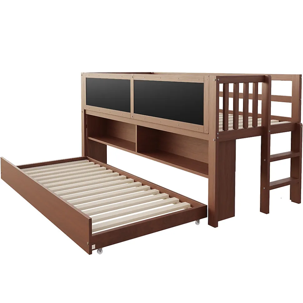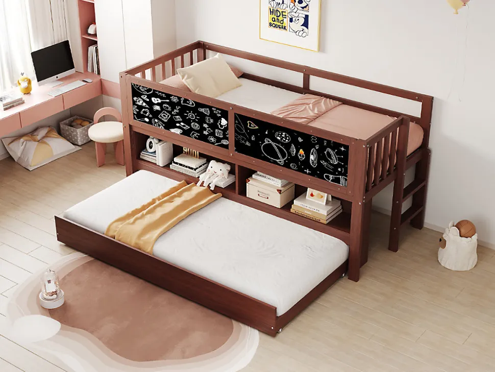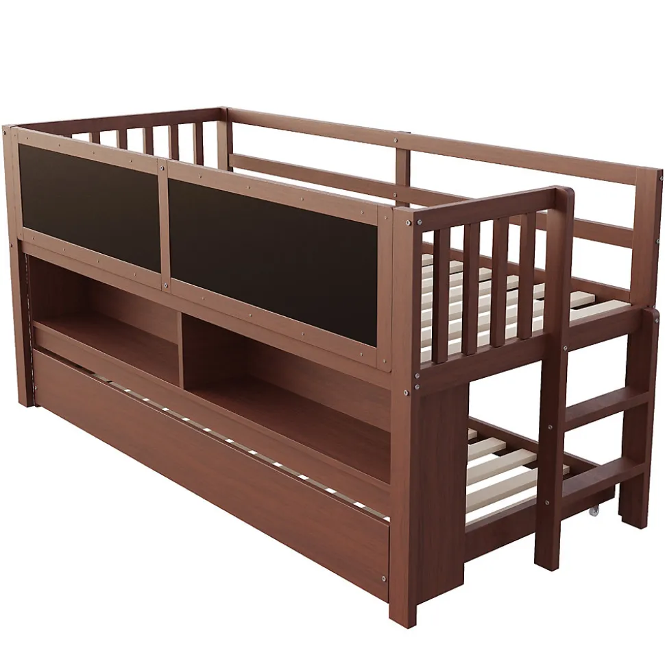 - Design fonctionnel et ludique intégrant des panneaux tableau à craie sur les côtés, finition bois brun et lignes équilibrées pour s’harmoniser dans une chambre enfant tout en restant sobre.