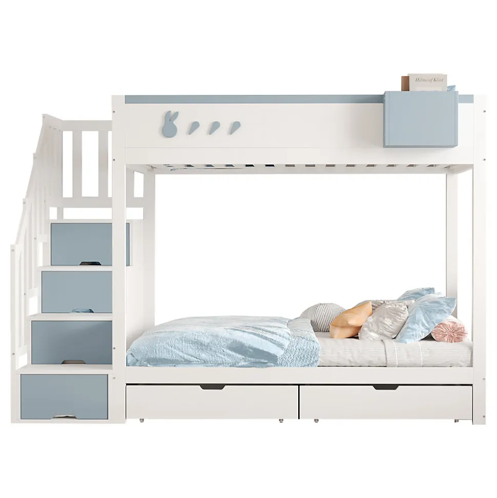 Design & styleCe lit superposé 90×200 cm joue la carte du charme enfantin avec un garde-corps orné de motifs lapin et carotte et un contraste blanc/bleu qui anime la pièce sans l’alourdir. Ses lignes sont équilibrées pour s’intégrer dans une chambre enfant ou ado tout en offrant une esthétique ludique et soignée.Fonctionnalités & rangement Étagère amovible intégrée au lit supérieur pour livres, jouets ou objets décoratifs, facilement détachable selon les besoins. Deux grands tiroirs sous le lit et une échelle avec porte de rangement optimisent l’espace et permettent d’organiser vêtements, linge de lit ou jouets. Barrières de sécurité continues et sommiers à lattes sur les deux couchages pour un maintien régulier des matelas.Matériaux & entretienStructure en bois (pin), contreplaqué et MDF offrant solidité et durabilité pour un usage quotidien. Finition blanc/bleu (ou blanc/rose selon modèle). Surfaces faciles à nettoyer avec un chiffon doux et un produit non abrasif.Dimensions & capacitésDimensions totales : 252,5 x 95 x 167 cm. Couchage : 90×200 cm. Nombre de lattes : 30. Poids produit : 104 kg ; poids total colis : 114 kg. Capacité de charge : 120 kg par lit. Épaisseur matelas recommandée : 8–12 cm.Installation & emballageMontage complet requis, temps estimé env. 2 heures avec deux personnes. Produit livré en 5 colis pouvant arriver séparément. Outils fournis ; évitez l’usage d’outils électriques pour préserver les pièces. Notice incluse pour un montage sécurisé.