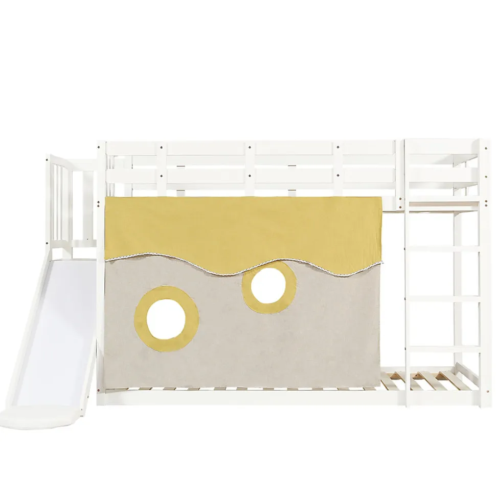 Design & usageCe lit superposé 90×200 cm combine une silhouette ludique et une finition blanche neutre pour s’adapter à divers styles de chambre enfant ou ado. Le toboggan transforme l’accès en activité récréative tandis que les rideaux inclus créent un espace intime et cocooning pour l’enfant.Fonctionnalités & sécuritéÉchelle intégrée et toboggan pour une montée et descente ludiques.Garde-corps et barrières latérales sur le lit supérieur pour réduire les risques de chute.Rideaux fournis pour plus d’intimité et zones de jeu sous le lit supérieur.Matériaux & dimensionsStructure en MDF et pin avec éléments en contreplaqué pour les lattes. Dimensions totales : 244,5x165x140,5 cm. Couchage : 90×200 cm (épaisseur matelas recommandée ≤10 cm). Poids total approximatif : 52,5 kg. Charge admissible : 180 kg.Installation & entretienProduit livré en deux colis ; montage requis avec la notice fournie, deux personnes recommandées. La structure n’est pas réversible gauche-droite. Surfaces faciles à entretenir : nettoyer avec un chiffon doux et humide, ne pas utiliser d’agents corrosifs.Emballage & informations complémentairesLivré en 2 colis pouvant arriver séparément. Matelas non inclus. Origine : Chine. Conçu pour optimiser l’espace et proposer un coin sommeil et jeu sécurisé dans la chambre d’enfant.