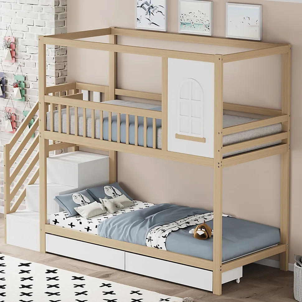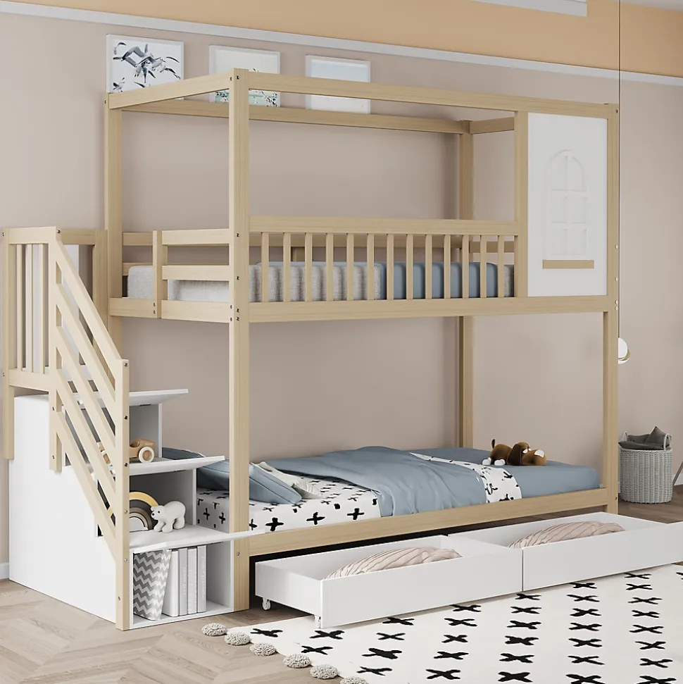 Design & styleCe lit superposé présente un look maison original avec un élément fenêtre et des patères sous la fenêtre pour suspendre décorations ou accessoires. Couleurs bois naturel et blanc pour une intégration sobre et chaleureuse dans la chambre d’un enfant ou d’un adolescent. Les lignes jouent sur l’esthétique tout en restant fonctionnelles.Fonctionnalités & rangement Deux grands tiroirs sous le lit pour le linge de lit ou les vêtements, accessibles facilement. Échelle latérale sécurisée dont chaque marche intègre un tiroir dissimulé pour jouets, livres ou petits objets. Garde-corps sur le lit supérieur pour la sécurité et sommiers à lattes inclus (30 lamelles) pour un support stable du matelas.Matériaux & sécuritéAssemblage de pin massif, contreplaqué et panneaux MDF pour une construction robuste et durable. Chaque couchage supporte une charge allant jusqu’à 120 kg. Épaisseur de matelas recommandée : 8-12 cm. Le design intègre des garde-corps et des accès sécurisés pour limiter les risques lors de l’utilisation.Installation & emballageMontage complet requis, deux personnes recommandées ; outillage de base fourni, tournevis nécessaire. Livré en 3 colis (poids total paquet env. 85 kg, produit 79 kg). Dimensions totales : 252 x 96 x 192 cm. Temps d’assemblage estimé : environ 2 heures. Ne pas utiliser d’outils électriques puissants lors du montage pour préserver les éléments bois.