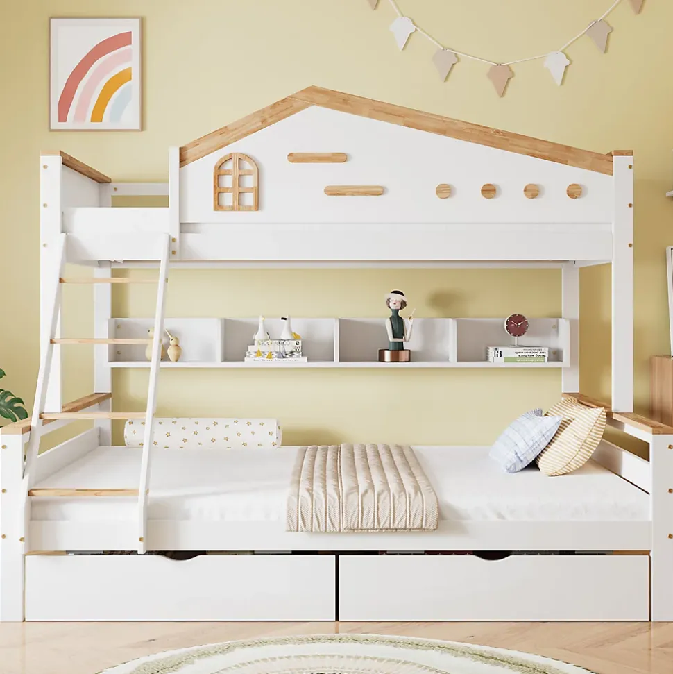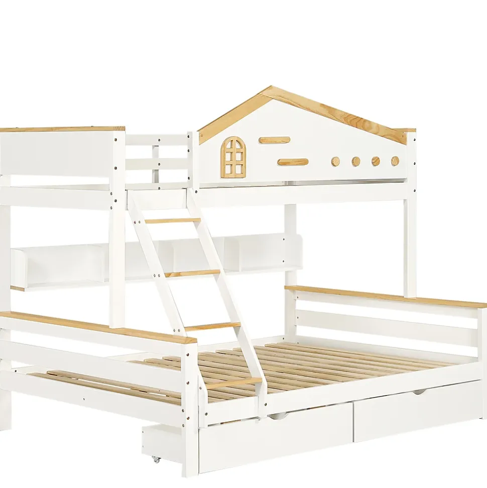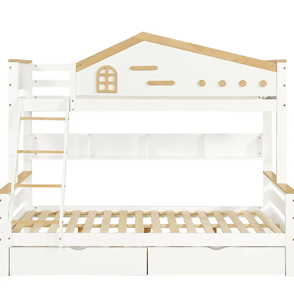 1. Design attrayant : Les lits superposés arborent une combinaison de blanc et de tons naturels, agrémentée de petites fenêtres décoratives sur les panneaux de la rambarde. Ce design original confère au lit une allure unique et en fait un élément particulièrement attrayant dans la chambre d’enfant. 2. Nombreux rangements : Ce lit se distingue par ses étagères ouvertes sur tout un côté. Celles-ci permettent de ranger télécommandes, lunettes et autres petits objets, ainsi que des collections personnelles comme des disques vinyles, des objets de collection d’anime ou des décorations, offrant ainsi un espace de rangement à la fois pratique et fonctionnel. 3. Sécurité optimale : La couchette supérieure est entièrement entourée de rambardes, assurant une sécurité accrue et empêchant les enfants de tomber pendant leur sommeil. 4. Solutions de rangement pratiques : La couchette inférieure est équipée de deux tiroirs spacieux, parfaits pour ranger le linge de lit, les vêtements ou les jouets. 5. Accès sécurisé par une échelle inclinée à quatre marches : L’accès à la couchette supérieure se fait par une échelle inclinée à quatre marches, à la fois sûre et pratique. Cette échelle est conçue pour une montée stable et facile, particulièrement adaptée aux enfants. 6. Pied de soutien central pour le lit inférieur : Le lit inférieur est doté d’un pied de soutien central qui lui confère une stabilité accrue. Ce pied garantit la sécurité et la stabilité du lit, même en cas d’utilisation intensive, renforçant ainsi sa structure et améliorant la sécurité. 7. Montage facile : Des instructions détaillées et toutes les pièces nécessaires sont fournies pour faciliter le montage. La simplicité d’installation vous permettra de profiter pleinement de votre nouveau lit. Remarque : Ce lit ne comprend pas de matelas.