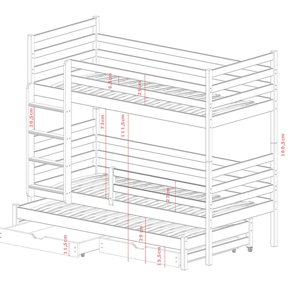 - Lit : A partir de 6 ans pour le lit en hauteur – Poids maximum conseillé : 100 kg par couchage – Echelle pouvant être montée à droite ou à gauche – Hauteur maximum conseillée pour les matelas du lit : 13 cm non inclus – Dimensions conseillées pour le matelas du lit gigogne : 90 x 190 x 8 cm non inclus – Barrière (amovible et non fixée pour le lit du bas) incluse – Lit gigogne et tiroirs sur roulettes inclus – Sommier à lattes inclus – Peut être divisé en 2 lits séparés
