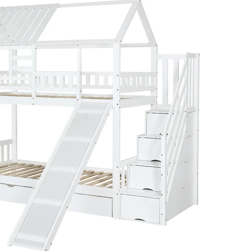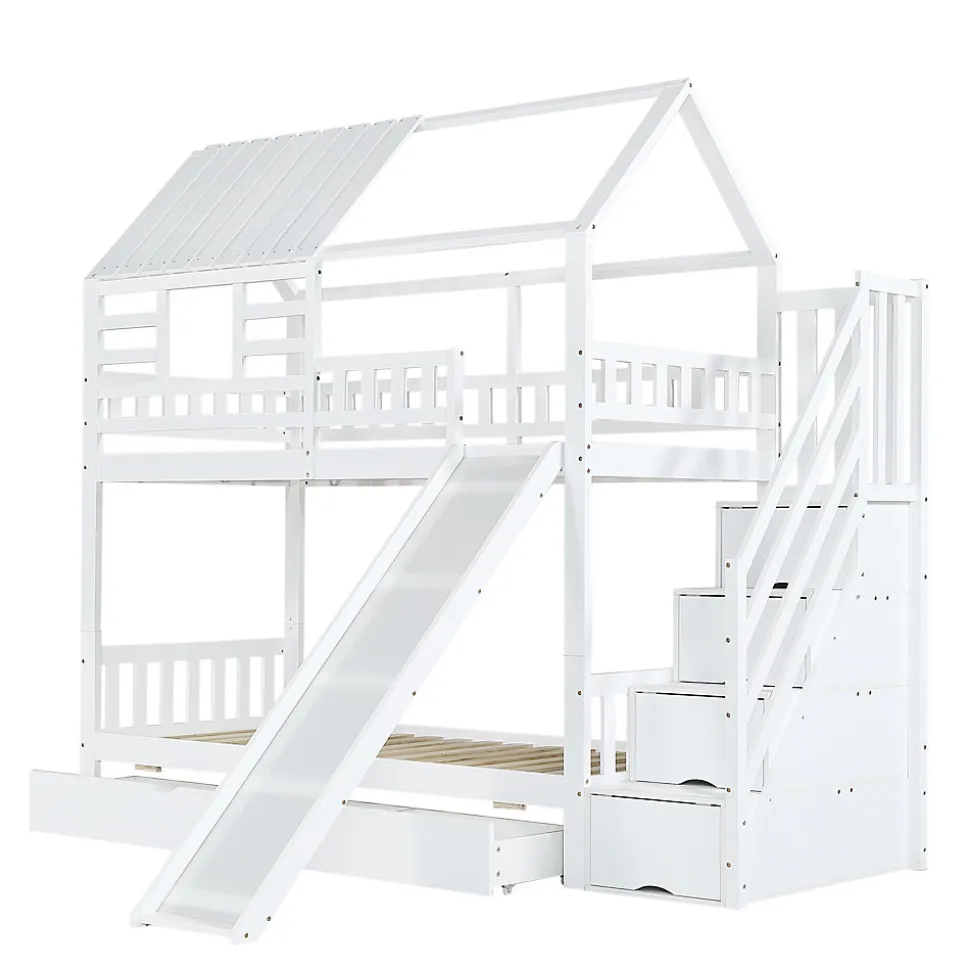 Design maison créatif : Avec son toit et ses fenêtres décoratives, ce lit crée un environnement magique pour l’enfant, parfait pour les jeux et la détente.Rangement fonctionnel : La treppe comprend des tiroirs pour organiser les jouets et les livres, tandis que les grands tiroirs sous le lit permettent un rangement supplémentaire.Toboggan amusant : Le toboggan intégré ajoute une dimension de jeu en permettant aux enfants de descendre en toute sécurité, favorisant ainsi l’activité physique.Sécurité renforcée : Entouré de grilles sur les côtés, le lit assure une sécurité maximale.Installation facile : Fournit toutes les pièces nécessaires avec des instructions claires pour un montage facile.Dimensions :Dimensions totales : 254×213,5×223 cmPoids total : 107,5 kgMatratze : 90×200 cm, 11 cm de profondeur recommandéeCapacité de charge : 120 kg (lit), 50 kg (toboggan)
