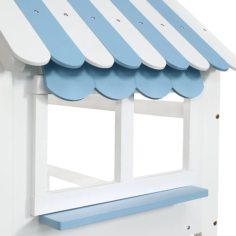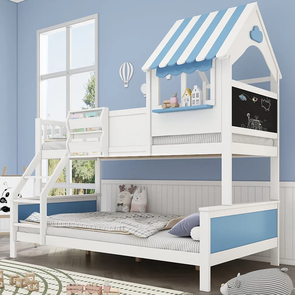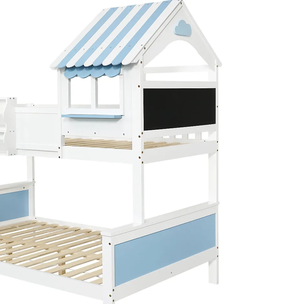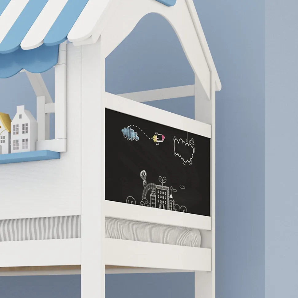 Ce lit superposé double couchage est une solution élégante et pratique pour les chambres d’enfants. Avec sa combinaison blanc et bleu et ses fenêtres originales, il crée un espace ludique et sécurisé.L’escalier incliné à trois marches assure une montée facile, tandis qu’un grand tiroir de rangement optimise l’espace. Le tableau noir sur le côté ajoute une touche interactive idéale pour dessiner ou écrire.Points forts :Toit et fenêtres décorativesBarrières de sécurité sur 4 côtésEscalier incliné à trois marchesTableau noir latéralDeux couchages pour un espace partagéStyle adaptable à tout décorDimensions & poids :Dimensions totales : 205x125x206 cmPoids total : 63,5 kgMatelas recommandés : 90×200 cm & 120×200 cm (épaisseur ≤13 cm)Charge maximale : lit 120 kg / tiroir 5 kgCaractéristiques :Matériaux : Pin + MDF + contreplaquéLattes : boisCouleur : Blanc + BleuÀ monter soi-mêmeNombre de colis : 3