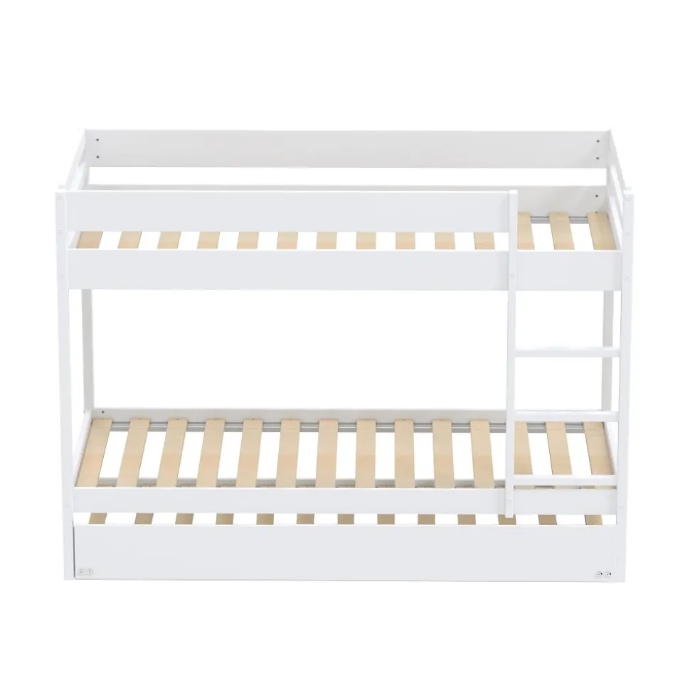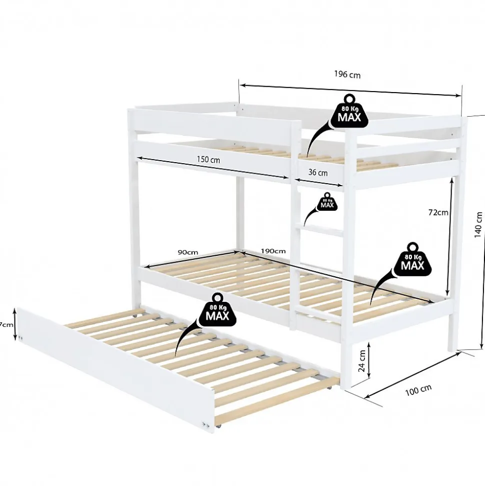 WALLY Lit superposé avec tiroir de lit – Structure en bois épicéa massif – Coloris blanc – Finition laqué – Echelle non réversible – Couchage 3 x 90 x 190 cm – Poids maximum supporté pour chaque couchage : 80 kg – Sommier inclus – Livré sans matelas – Dimensions : L196 x P100 x H139.6 cm