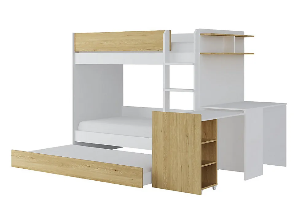 - Lit superposé avec lit gigogne 3 x 90 x 190 cm et 2 bureaux – Structure : Panneaux de particules – Coloris : Blanc et naturel – Dim : L196 x P100,4 x H160,3 cm – Style : Moderne + Matelas – Harmonie et praticité avec DOMATI