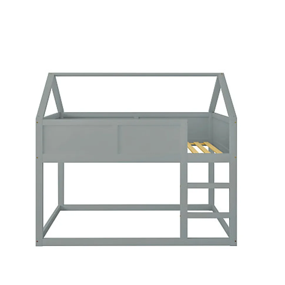 Lit superposé bas 90×200 cm en bois massif gris, idéal pour deux enfants, avec design multifonction et esthétique moderne