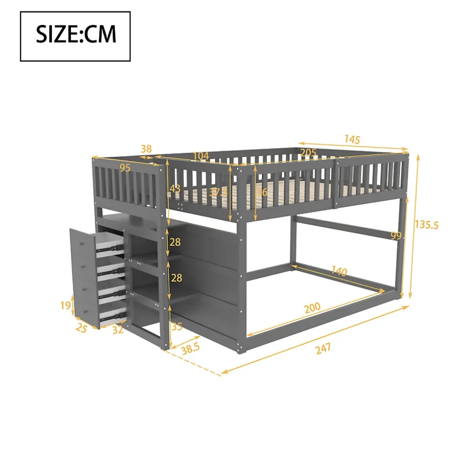 DescriptionLit superposé bas pour enfants 140 x 200 cm, alliant sécurité, confort et design élégant. Sa finition grise moderne s’intègre facilement à tous les décors de chambre. L’escalier sécurisé intègre quatre tiroirs de rangement, idéaux pour jouets, vêtements ou literie, tandis que la haute barrière autour du lit supérieur assure une protection maximale. Le lit inférieur peut servir de second couchage ou d’espace de jeu (sommier non inclus).CaractéristiquesLit bas sécurisé : Accès facile au lit supérieur, idéal pour les jeunes enfants.Escalier avec rangement : 4 tiroirs intégrés pour un espace organisé et pratique.Polyvalent : Le lit inférieur peut être utilisé comme lit ou aire de jeux.Finition élégante : Gris moderne et lumineux pour tous les styles d’intérieur.SpécificationsDimensions hors tout : 247 x 145 x 135,5 cmCapacité de charge : 120 kgÉpaisseur de matelas recommandée : 8-12 cmMatériau : Pin + contreplaqué + MDFNombre de lattes : 15Nombre de colis : 3Poids total : 76 kgMontage requis : Oui, outils inclus