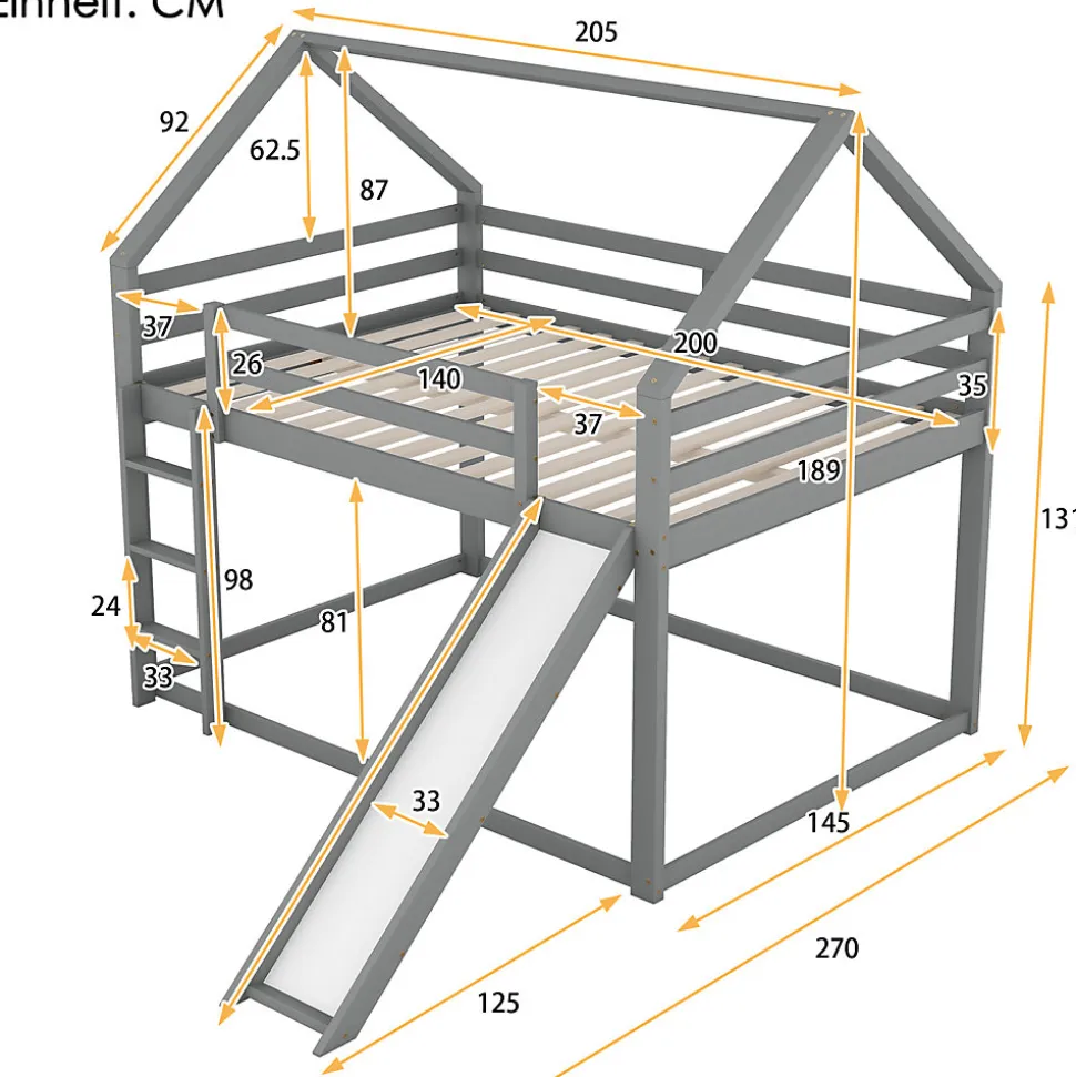 [Lit cabane avec toboggan] Ce lit, en forme de cabane originale, apporte une touche ludique à la chambre de votre enfant. Il est équipé d’un toboggan pour son plus grand plaisir. Il offre à votre enfant un espace pour dormir et s’amuser au lit. [Surface de couchage de 140 x 200 cm] Les deux lits, supérieur et inférieur, offrent une surface de couchage de 140 x 200 cm. Votre enfant aura ainsi plus d’espace pour bouger et deux enfants pourront dormir confortablement ensemble. Si votre enfant invite un ami à la maison, ce lit sera largement suffisant ! [Sécurité enfant] Le lit inférieur est plus adapté aux jeunes enfants et réduit les risques de chute. Le lit supérieur est équipé d’une barrière de sécurité robuste pour empêcher les enfants de tomber. Les enfants peuvent facilement accéder au lit supérieur grâce à l’escalier, ce qui renforce également la stabilité du lit. La position de l’escalier et du toboggan est réversible. [Cadre de lit en bois de haute qualité] Fabriqué en pin massif et MDF, ce lit superposé est conçu pour durer et solidement fixé par des vis robustes pour une stabilité optimale. Il est doté d’un support de matelas intégré et d’un sommier à lattes solides pour prolonger la durée de vie de votre matelas. [Installation facile] Des instructions de montage détaillées sont incluses, ainsi que tous les outils nécessaires. Le montage vous permettra de comprendre la structure du lit et de l’apprécier pleinement. Remarque : Ce lit est vendu sans matelas. Description + Dimensions: Matériaux : Pin, MDF et contreplaqué Couleur : Gris / Blanc Nombre de colis : 2 Montage requis : Oui Origine : Chine Dimensions du produit : 205 x 270 x 189 cm Dimensions du colis : Voir les spécifications Dimensions du lit : 140 x 200 cm Hauteur : 189 cm Nombre de lattes : 15 Poids du produit : 49,15 kg Charge maximale du lit : 120 kg: