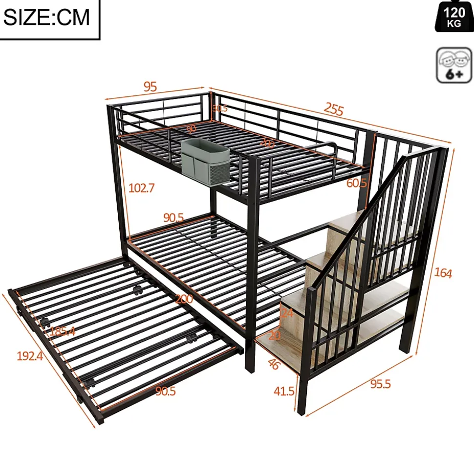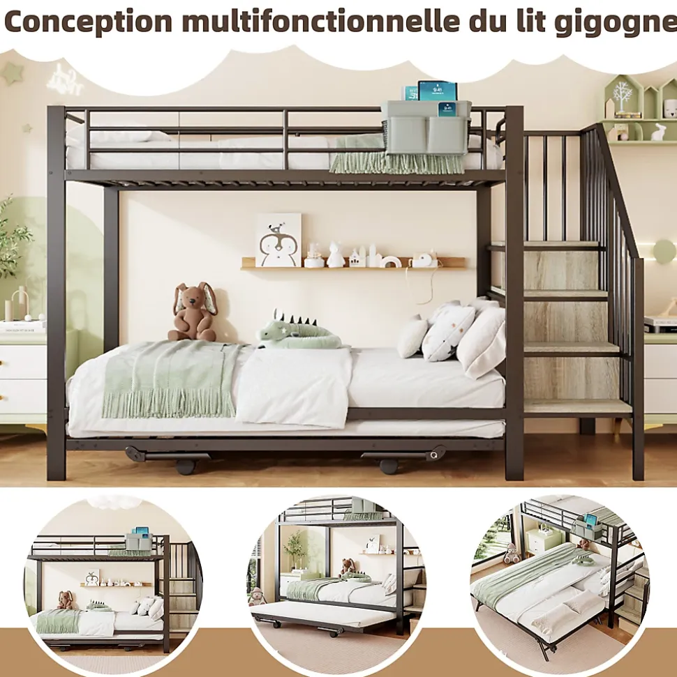 Vous avez plusieurs jeunes enfants à la maison et peu d’espace dans la chambre ? Alors ce lit superposé est fait pour vous ! Fabriqué avec une structure en fer de haute qualité, il est stable et robuste et donne à vos enfants un sentiment de sécurité. Le design astucieux des lits superposés exploite de manière optimale l’espace vertical et offre à chaque enfant son propre espace de couchage. L’ingénieux lit gigogne change véritablement la donne : retirez-le pour le transformer instantanément en un lit spacieux de 180 x 200 cm qui peut facilement accueillir des invités pour la nuit. Les marches de rangement intégrées sont incroyablement pratiques et offrent un espace de rangement caché pour les jouets et les petits objets. De plus, des sacs en tissu bien pensés facilitent l’organisation des petits objets. Achetez-en un pour vos tout-petits dès aujourd’hui !Descriptif + dimensionsMatériau du lit : métalTaille: 90×200 cmCouleur: NoirNombre de colis : 2Assemblage requis : OuiOrigine : ChineDimensions du produit : 255 x 95,5 x 164 cmDimensions intérieures du lit : 90 x 200cmHauteur totale : 164cmCapacité de poids : 120 kgÉpaisseur recommandée du matelas (sans matelas) : 10 cmDimensions intérieures du lit gigogne gigogne : 90*185Capacité de charge du lit gigogne gigogne : 120kgÉpaisseur de matelas recommandée pour lit gigogne gigogne : 10 cmRemarques※ En raison des données de mesure manuelle, il peut y avoir une erreur de 2 à 3 cm.※ Toutes les images de produits sont prises avec des produits réels, mais en raison de l’influence de la lumière du soleil et d’autres facteurs, il peut y avoir certaines différences de couleur.※ Ce produit sera divisé en 3 colis pour la livraison. Il se peut qu’ils n’arrivent pas en même temps. S’il vous plaît, attendez patiemment.※ Si vous avez des questions lors de l’installation, veuillez nous contacter dès que possible.