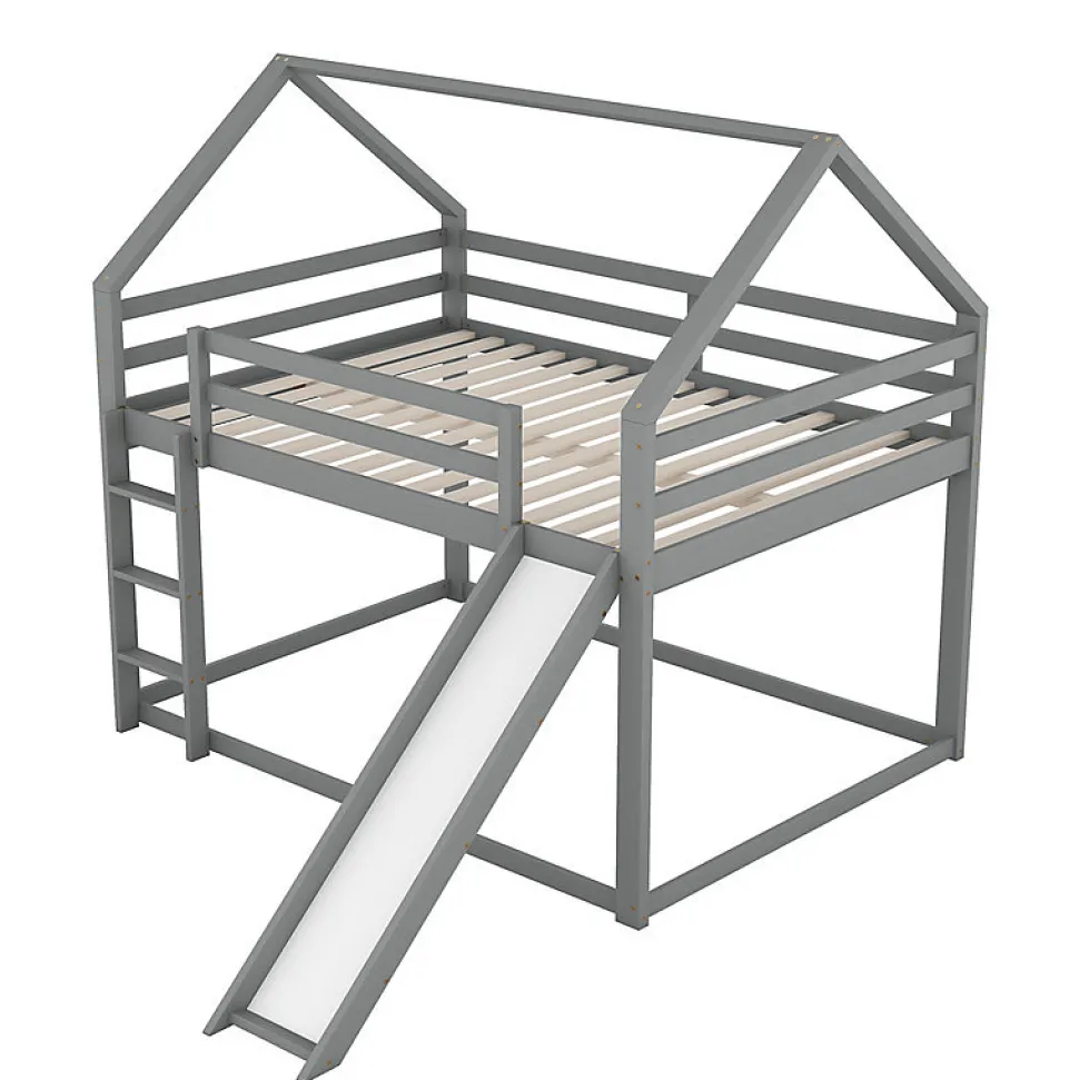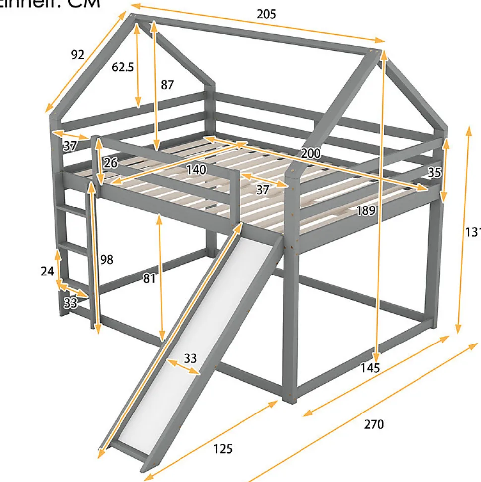 Transformez la chambre de votre enfant en un espace de rêve avec ce lit superposé 140 × 200 cm gris, en forme de maisonnette avec toboggan et échelle intégrés. Il allie jeu et confort dans un design unique. Design maison avec toboggan : structure originale et amusante qui stimule l’imagination des enfants tout en leur offrant un espace de repos sécurisé. Deux grands couchages : 140 × 200 cm en haut et en bas, parfaits pour deux enfants ou les soirées pyjama. Sécurité renforcée : barrières hautes, lit du bas au sol pour les plus petits, échelle robuste et toboggan interchangeables selon l’agencement de la pièce. Structure solide : en pin massif et MDF, vissé solidement, avec lattes robustes pour une excellente durabilité. Installation facile : livré avec notice détaillée et outils de montage inclus.Un meuble 2 en 1 qui combine fonctionnalité et plaisir pour accompagner les enfants dans leur quotidien.Caractéristiques techniques :Dimensions totales : 205 × 270 × 189 cmDimensions couchage : 140 × 200 cm (haut et bas)Hauteur : 189 cmNombre de lattes : 15Charge maximale : 120 kgPoids : 49,15 kgMatériaux : pin massif, MDF, contreplaquéCouleur : grisOrigine : ChineMontage requis, livré en 2 colis.