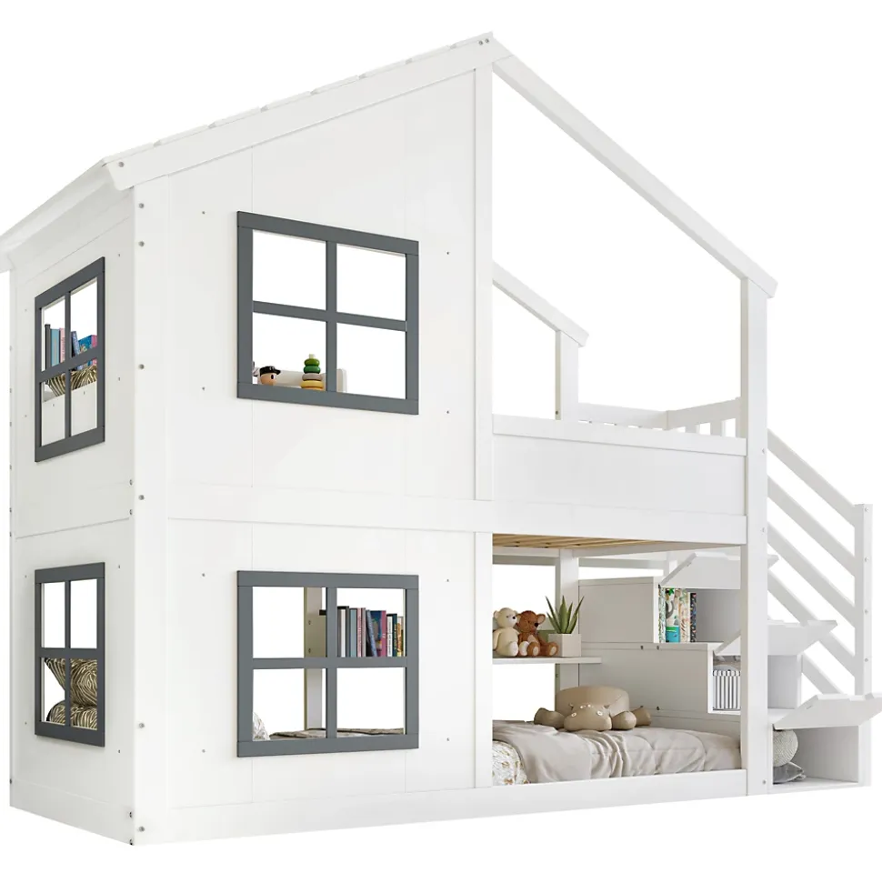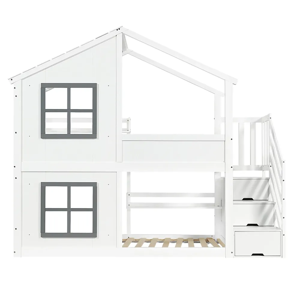 •【Grand espace de rangement】Ce lit dispose de trois compartiments de rangement, offrant un accès pratique et sécurisé aux objets tout en proposant un espace de rangement idéal pour les jouets, les livres ou les vêtements.•【Un design féérique】Le joli design de la fenêtre et du toit crée un espace de jeu et de sommeil onirique, stimulant l’imagination des enfants.•【Sûr et stable】Le sommier à lattes robuste assure une stabilité optimale et un confort de sommeil parfait, garantissant la sécurité des enfants.•【Haute qualité et durabilité】Fabriqué en pin, MDF et contreplaqué, disponible en blanc et gris, ce lit allie durabilité, robustesse et esthétique.•【Un choix polyvalent】Il s’intègre facilement à tous les styles de décoration de chambre d’enfant. Mesurant 90 x 200 cm, c’est aussi le cadeau idéal pour les petits aventuriers.•【Facile à assembler】Des instructions détaillées et des pièces complètes sont disponibles pour vous aider à réaliser l’assemblage rapidement.